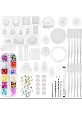 Набір складається з: - 10 пластикових піпеток - 10 свердлів різної товщини - 1 тримач для свердл - 10 напальчників – 50 шт. тримач кулона колір срібло – 50 шт. тримач кулона колір золото - набір блискіток у холдері 12 різних кольорів - Форма кулі 1 шт. з 2 частин - форма круглого кулона 2 см у діаметрі - форма круглого кулона 2,5 см у діаметрі - Форма кільця 2 см у діаметрі - Форма кільця 2.5 см у діаметрі - 3 форми маленьких кулонів краплеподібної форми - 1 молд на 3 діаманти - 1 форма куб - 1 форма витягнутого кулона круглої форми - 1 молд витягнутого кулона квадратної форми - 1 молд витягнутого кулона шестигранної форми - 1 молд для круглого дзеркальця - 1 молд маленького браслета - 1 великий молд на 12 форм кулонів