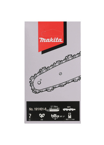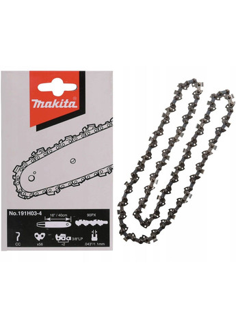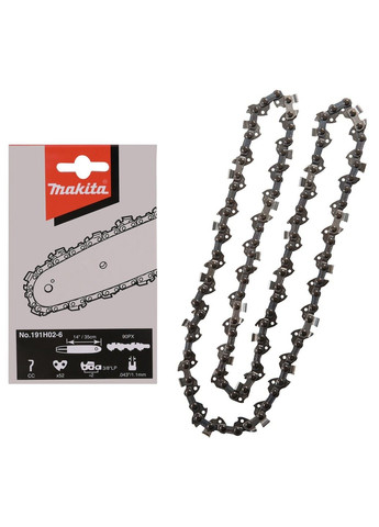 Ланцюг пиляльний Makita 191H02-6 призначений для роботи ланцюговою пилою з направляючою шиною робочою довжиною 35 см, має крок 3/8", ширину ведучої ланки (калібр) 1.1 мм, кількістю ведучих ланок 52 шт.