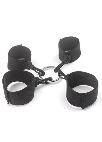 Бондажний комплект у чорному кольорі із високоякісних гіпоалергенних матеріалів. Складається з м'яких регульованих наручників з D-кільцями, фіксаторів для ніг з D-кільцями та перехресного фіксатора у вигляді кільця, до якого кріпляться чотири коротких ремінця з карабінами. Фіксатор дає можливість сполучити наручники та кайдани для ніг і закріпити їх, наприклад, за спиною чи спереду. Бонусом йде оксамитова маска на очі. Комплект ідеально підійде для справжніх поціновувачів розваг у стилі БДСМ.
