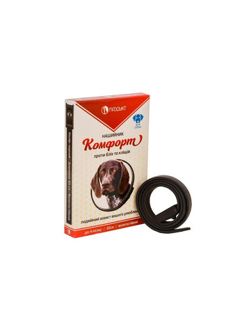 Нашийник проти бліх та кліщів Комфорт для собак (нашийник)   Опис Полімерна стрічка з фіксатором зі специфічним запахом складових компонентів. Склад 1 г нашийника містить діючу речовину: діазинон – 60 мг. Допоміжні речовини: полівінілхлорид, барвник. Фармакологічні властивості ATCvet QP53, ектопаразитициди, інсектициди і репеленти (QP53AF15, діазинон) Діюча речовина нашийника діазинон – інсекто-акарицид контактної дії, належить до групи фосфорорганічних сполук, ефірів тіофосфорної кислоти; має широкий спектр інсектоакарицидної дії у відношенні ектопаразитів – бліх (Ctenocephalides canis, Pulex irritans), волосоїдів (Trichodectes canis), вошей (Linognathus setosus), паразитиформних кліщів (Ixodes ricinus, Dermacentor spp., Rhipicephalus spp.). Діазинон пригнічує фермент ацетилхолінестеразу, необхідний для функціонування нервової системи комах та кліщів, блокує гангліозні периферичні нерви ектопаразитів, викликаючи нейротоксикацію, внаслідок чого порушується координація рухів, настає параліч і загибель ектопаразитів. Діазинон, поступово виділяючись із поверхні полімерної стрічки, переноситься на волосяний покрив тварини і виявляє інсекто-акарицидну дію щодо бліх, волосоїдів, вошей та кліщів. Застосування Профілактика та лікування собак при захворюваннях, спричинюваних ектопаразитами: сифонаптерозах, триходектозі, ліногнатозі, іксодидозах. Дозування Нашийник призначений для зовнішнього застосування. Безпосередньо перед застосуванням нашийник виймають із захисного упакування та закріплюють на шиї тварини таким чином, щоб між шиєю та нашийником залишався невеликий проміжок (1 – 1,5 см). Надлишок стрічки обрізають з урахуванням можливого росту тварини. Підігнаний належним чином нашийник у закріпленому стані повинен вільно рухатися на шиї і не стримувати росту тварини. Постійне використання нашийника забезпечує захист тварини від ектопаразитів протягом 4 місяців. Протипоказання Індивідуальна підвищена чутливість тварини до діючої речовини препарату (діазинон). Не застосовувати цуценятам віком до 8 тижнів. Не застосовувати хворим, виснаженим та старим тваринам, а також самкам під час вагітності та лактації. Застереження Упакування нашийника слід відкривати безпосередньо перед застосуванням. У деяких випадках у тварин може спостерігатись індивідуальна підвищена чутливість до діазинону і носіння нашийника може викликати місцеві реакції (випадіння шерсті, свербіж, подразнення шкіри). У таких випадках застосування нашийника припиняють. Після контакту з нашийником ретельно вимити руки водою з милом. Форма випуску Нашийник довжиною 65±5 см, вкладений у пакет із полімерної плівки і запакований у картонну коробку. Зберігання У сухому, захищеному від світла, недоступному для дітей та тварин місці при температурі від 0 до 25 оС окремо від кормів для тварин, води та продуктів харчування. Термін придатності 2 роки. Термін придатності нашийника після розкриття упакування – 4 місяці.Розмірна сітка: 0