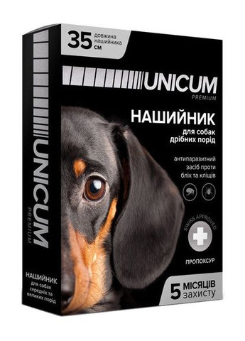 UNICUM premium нашийник для собак від бліх і кліщів, 35 см - це ексклюзивна амуніція преміальної серії для собак, що захищає їх від комах і паразитів. Модель, довжиною 35 сантиметрів, призначена для собак невеликих порід або цуценят. Перевагами преміального нашийника UNICUM є: - міцність і зносостійкість матеріалів; - регульована застібка; - надійний захист від ектопаразитів: бліх, вошей, волосоїдів і іксодових кліщів; Водостійкий нашийник зберігає свої захисні функції до п'яти місяців безперервної експлуатації. Входять до складу нашийника мікрокомпоненти і використовувані при його виробництві високоякісні матеріали, характеризують його як безпечну амуніцію для домашніх улюбленців. Склад і фармакологічні властивості амуніції До складу нашийника входить пропоксур. Це діюча речовина, яка в допустимій дозі не абсорбується з шкірним покривом, не чинить на тварин жодних побічних ефектів і не викликає ускладнень, при цьому активно захищає від бліх, вошей, волосоїдів і кліщів. У 10 г маси нашийника міститься 1 г пропоксура, доза якого не є токсичною для ссавця. Препарат не має властивості накопичуватися в організмі тварини. Ефективність дії нашийника і тривалість захисту залежить від довжини, стану шерсті і від ступеня інвазії. Нашийник являє собою поліхлорвінілову стрічку - полімерна смужка високої якості, що відрізняється стійкістю до лугів і мінеральних масел. При нагріванні не виділяє токсичних і безпечних елементів. Правила використання і застереження Упаковка преміум нашийника UNICUM розкривається безпосередньо перед використанням. Власнику тварини, при надяганні нашийника, рекомендується використовувати гумові рукавички при наявності подряпин або пошкоджень шкіри на руках. Преміум нашийник UNICUM фіксується на шиї тварини, залишаючи невеликий проміжок між ними, для комфортного росту і свободи рухів улюбленця. При випадковому потраплянні препарату на шкіру або в очі, необхідно ретельно промити їх проточною водою, а при потраплянні всередину негайно звернутися до лікаря. Використання амуніції протипоказано для хворих і ослаблених тварин, а також чутливим до компонентів, що входять до складу пристосування.
