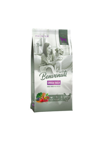 Benvenuti – лінійка корму для собак Щоб допомогти Вашому улюбленцю залишатися активним і веселим протягом усього життя, важливо забезпечити йому хороше харчування. Сухий преміум-раціон містить м’ясні інгредієнти на першому місці у складі, хондроїтин та глюкозамін для здорових суглобів собак великих порід вагою від 25 до 90 кг і віком від 1 року. Раціон збагачений, комплексом Омега 3 + Омега 6 для здорової шкіри та блискучої шерсті та міксом Овочів, фруктів та трав для загальної підтримки здоров’я вашого улюбленця. СКЛАД Дегідратовані протеїни м’яса птиці (26%), білий рис, кукурудза, свинячий яловичий жир, гідролізований білок птиці, гідролізована печінка свійської птиці, м’якоть буряка, мінерали, насіння льону (0,5%), лососева олія (0,5%), сушена броколі (0,15%), сушені помідори (0,15%), сушений шпинат (0,15%), глюкозамін гідрохлорид (0,15%), хондроїтин сульфат (0,15%), сушена журавлина (0, 15%), сушена чорниця (0,15%), суміш екстрактів трав (Yucca Mojave (0,15%), Rosmarinus sp. (0,15%), Curcuma sp. (0,15%), Vitis sp. , Citrus sp., Eugenia sp.). АНАЛІТИЧНІ КОМПОНЕНТИ (%) Сирий білок: 25,0, Сирий жир: 12,0, Неорганічна речовина: 7,0, Сира клітковина: 2,2, Вологість: 9,0, Омега-3 жирні кислоти: 0,5%; Омега-6 жирні кислоти: 2,0%. ДОБАВКИ (/кг) харчові добавки: вітамін А – 14 000МО, вітамін D3 – 1000 МО, вітамін Е (а-токоферилацетат) – 100 мг, залізо (залізо (II) сульфат (моногідрат)): 100 мг, мідь (мідь (II) сульфат (пентагідрат)): 10,0 мг, цинк (цинк (II) сульфат (моногідрат)): 125,0 мг , марганець (марганцевий (II) сульфат (моногідрат)): 5,0 мг, йод (йодат кальцію): 1,5 мг, селен (селеніт натрію): 0,2 мг. Технологічні добавки: Антиоксиданти затверджені в Европейскому Союзі.