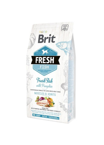 Корм із високим вмістом свіжого м'яса для дорослих собак великих порід. Повнораціонний корм для собак. 40% свіжого м'яса Високий вміст якісного м'яса та його щадне оброблення є гарантією чудового смаку та запаху. Задовольнить смаки навіть найвимогливіших собак-гурманів БЕЗ ГЛЮТЕНА – БЕЗ СОИ – БЕЗ ГМО – БЕЗ КОНСЕРВАНТОВ – БЕЗ КРАСИТЕЛЕЙ — БЕЗ ХИМИЧЕСКИХ АРОМАТИЗАТОРОВ Склад: свіжа риба (40%), сушена курка (20%), гарбуз (10%), курячий жир (консервований зі змішаними токоферолами), овес, гречка (4%), яблука, буряк (2%), лососева олія, пивні дріжджі, лляне насіння, куряча печінка, колаген, водорості, мангольд (0.2%), петрушка (0.05%), розмарин, чебрець, оксамит, кульбаби, пробіотики (Enteroccus faecium 1×109 КУО), глюкозамін 1700 мг/кг, хондроїтинсульфат 1300 мг/кг, фруктоолігосахариди 220 мг/кг, β-глюка 200 мг/кг, манноголінголінси 180 мг, 180 мг/к, юка мг/кг, мідія із зеленими губами 100 мг/кг. Чиста вага: 12 кг