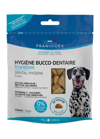 Поступове утворення зубного нальоту викликає відкладення зубного каменю на зубах, неприємний запах з рота та запалення ясен, яке може бути болючим. FRANCODEX DENTAL DOG TREATS допомагає видалити залишки їжі та обмежити накопичення зубного каменю завдяки абразивній дії їхнього зернового покриття. Вони містять насіння петрушки та масло м'яти перцевої для ефективної боротьби з неприємним запахом із рота вашого собаки. Зрештою, вітамін С допомагає підтримувати здоров'я ясен. Регулярна гігієна зубів важлива для вашого собаки з раннього віку, щоб запобігти розвитку зубного каменю та обмежити проблеми із зубами; Склад Інгредієнти: крупи, олії та жири, субпродукти рослинного походження, м'ясо та субпродукти тваринного походження (4% качки), мінеральні речовини; Добавки (/кг): антиоксидант, харчові добавки: вітамін А 2000 МО, вітамін D3 300 МО, вітамін Е (RRR-альфа-токоферол) 113 мг, вітамін С 280 мг - сенсорні добавки: ароматизатори (екстракт розмарину, олія насіння петрушки 50 мг) барвник. Аналітичний склад: сирий протеїн 12%, сира зола 0,7%, сирий жир 25%, сира клітковина 1,3%, вологість 8%, Омега-3 жирні кислоти: 1,2% Омега-6 жирні кислоти: 3,2%. Енергія (метаболізована енергія): 4493 ккал/кг, тобто 6,7 ккал на частування. Спосіб застосування Ласощі для боротьби з неприємним запахом з рота (насіння петрушки та м'яти перцевої). Дозування вказане на упаковці; Запобіжні заходи Тримайте свіжу воду у легкому доступі. Зберігати у недоступному для дітей місці. Зберігати у прохолодному сухому місці. Не для споживання людиною.