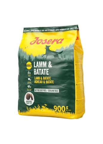Корм також багатий на корисну клітковину, джерелом якої є корисний батат. Варто відзначити і чудові смакові якості корму. Собака буде не тільки здорова, а й щаслива! Німецький виробник Josera по-справжньому дбає про наших вихованців. Особливості: ягнятина як єдине джерело тваринного білка; беззернова рецептура; з травами та плодами: плоди ріжкового дерева, корінь цикорію, малина, м'ята перцева, петрушка, ромашка, плоди шипшини, корінь солодки, аронія, чорниця, насіння пажитника, календула, фенхель; цінні жирні кислоти, цинк та мідь у легко засвоюваній органічній формі та біотин для здорової шкіри та блискучої вовни; L-карнітин та таурин підтримують серцеву функцію; виготовляється в Німеччині та проходить ретельну перевірку у власній акредитованій лабораторії; корм містить високоякісні, здорові та натуральні інгредієнти, які не є генетично модифікованими; без додавання консервантів, штучних барвників та ароматизаторів; сухий корм для собак Josera не випробовується на тваринах; без додавання пшениці, сої, цукру та молочних продуктів. Склад: білок ягняти, сушений 25,0%; батат, сушений 22,0%; жир свійської птиці; горохове борошно; картопляний білок; картопля, сушена; бурякова клітковина; дріжджі (частково гідролізовані) борошно плодів ріжкового дерева; яблучна клітковина; трави, фрукти; мінерали; корінь цикорію, мелений (природне джерело інуліну). Аналітичні складові: протеїн 25,0%; жир 16,0%; сира клітковина 2,3%; сира зола 9,0%; кальцій 2,10%; фосфор 1,15%; натрій 0,40%. Харчові добавки до 1 кг: 24.000 Н.А. вітамін А; 1800 Н.А. вітамін D3; 220 мг вітамін Е; 15 мг вітамін B1; 20 мг вітамін B2; 20 мг вітамін B6; 100 мкг; вітамін B12; 50 мг кальцій D-пантотенат; 90 мг нікотинової кислоти 5 мг фолієвої кислоти 1.000 мкг біотин; 1000 мг таурин; 250 мг L-карнітин; 250 мг залізо (сульфат (II) заліза моногідрат) 150 мг цинк (гліцин-хелат цинку-гідрат (твердий)) 18 мг марганець (марганець-(II) -оксид) 20 мг мідь (мідь (II) -гліцин-хелат-гідрат (твердий)) 2,00 мг й мг селену (селеніт натрію). Технологічні добавки: Антиоксиданти: екстракти, що містять токоферол і є природним походженням. Поради щодо годування: Забезпечте собаці постійний і безперешкодний доступ до свіжої питної води. Норми годування мають рекомендаційний характер. Адаптуйте живлення до індивідуального рівня активності вашого вихованця. Вага собаки, кг Кількість корму, (г) на добу Малоактивний/літній собака Звичайна активність Дуже активний собака 5 60 80 100 10 85 115 140 20 140 190 240 30 190 260 330 40 2 440 555 80 400 545 690 Фасування: 900 г, 15 кг