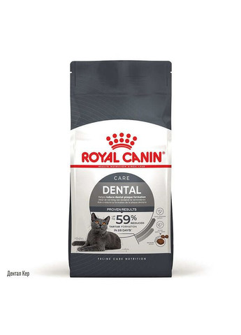 Зубний камінь утворюється при масивних відкладеннях зубного нальоту, може призвести до неприємного запаху з пащі та запалення ясен. Гігієна ротової порожнини грає вирішальну роль у підтримці здоров'я вашої кішки. Royal Canin Dental Care – ретельно збалансована формула, яка допомагає зберегти здоров'я ротової порожнини, знижуючи інтенсивність утворення зубного каменю. Переваги: Подвійна дія продукту: Механічне вплив: форма та розмір крокет спонукають кішку ретельніше розгризати корм, при цьому механічним шляхом щодня очищаючи зуби та сприяє зменшенню утворення зубного нальоту; Хімічну дію: формула збагачена активними речовинами, які пов'язують кальцій, що міститься в слині, та зменшують його відкладення на зубах у вигляді зубного каменю. Ретельно збалансована формула раціону сприяє зменшенню утворення каменю та покращує стан ротової порожнини та зубів тварини. Підтримка здоров'я сечовидільної системи. Відповідний баланс мінеральних речовин у раціоні сприяє підтримці здоров'я сечовивідної системи дорослої кішки. Доведена ефективність. При годівлі винятково сухим раціоном Royal Canin Dental Care (Royal Canin Oral Care) через 28 днів утворення зубного каменю знижувалося до 59%. Новий дизайн упаковки: Склад: дегідаратовані протеїни м'яса свійської птиці, рис, пшеничний глютен*, тваринні жири, кукурудза, кукурудзяна мука, рослинна клітковина, гідролізовані білки тваринного походження, пшениця, кукурудзяний глютен, мінерали (в т.ч. год. трифосфат натрію (0,2%)), буряковий жом, риб’ячий жир, соєва олія, фруктоолiгосахариди, оболонка та насіння подорожника. * L.I.P. - білки, вибрані за принципом високої засвоюваності. Аналітичний склад: сирий протеїн – 30%; сирий жир – 15%; сира зола – 7%; сира клітковина – 5,2%; пентанатрій трифосфат - 2 г/кг Добавки (на 1 кг): Харчові добавки: вітамін А - 14 000 МО; вітамін D 3 - 700 МО; залізо (3b103) – 35 мг; йод (3b201, 3b202) – 3,5 мг; мідь (3b405, 3b406) – 11 мг; марганець (3b502, 3b504) – 45 мг; цинк (3b603, 3b605, 3b606) - 133 мг; селен (3b801, 3b811, 3b812) - 0,06 мг. Антиоксиданти. Попередній дизайн упаковки: Склад: дегідратовані білки тваринного походження (птах), ізолят рослинних білків*, пшениця, рис, тваринні жири, борошно із зернових культур, рослинна клітковина, гідролізат білків тваринного походження (смачно-ароматичні добавки), мінеральні речовини, оболонка та насіння подорожника. *L.I.P.: білки, відібрані за принципом максимальної засвоюваності. Аналітичні компоненти: сирий протеїн - 30%; сирий жир - 15%; сира клітковина - 5,2%; 36 мг, E2 (йод): 3,6 мг, E4 (мідь): 11 мг, E5 (марганець): 47 мг, E6 (цинк): 99 мг, E8 (селен): 0,06 мг, консерванти, антиоксиданти. Рекомендована добова норма (новий дизайн упаковки) : Рекомендована добова норма (попередній дизайн упаковки): Вага 3 кг 4 кг 5 кг 6 кг Нормальна вага 46 г 56 г 66 г 75 г Зайва вага 36 г 45 г 52 г 60 г Інформація про інгредієнти та корм. Вся інформація про продукт представлена безпосередньо на пакованні. Корм готовий до вживання. Рекомендована добова норма корму вказана упаковці товару. Добова норма корму може відрізнятися залежно від умов середовища, розміру, віку та активності тварини. Давайте корм кімнатній температурі. Якщо Ви використовуєте корм для різноманітності харчування, відповідно зменшіть добову норму, що рекомендується. Надайте вихованцю доступ до свіжої питної води. Зберігайте у сухому прохолодному місці. Фасування: 400 г, 1.5 кг, 3.5 кг, 8 кг
