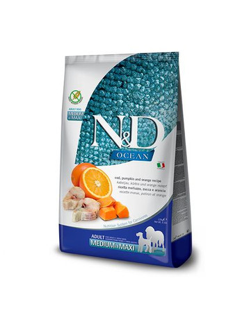 N&D Ocean для собак є повноцінним раціоном, що містить ВСІ необхідні поживні речовини для щоденного благополуччя наших чотирилапих членів сім'ї, привносить користь морепродуктів у їжу вашого вихованця.96 % білка тваринного походження, 0 % штучних консервантів, 0 % злаків, Основний інгредієнт, тріска, містить багато білка і мало жиру, що робить її відмінним джерелом білка.Тріска також багата на вітаміни та мінерали, а також джерелом жирних кислот Омега-3, які сприяють функціонуванню серцево-судинної, ендокринної та імунної систем.Гарбуз є типовим овочем італійської кухні, який має унікальні поживні та багато корисних властивостей, як-от антидіабетичні, підтримує імунну систему, активний проти вільних радикалів, що також призводить до антиканцерогенного ефекту, сприяє захисту серцево-судинної системи, регулює перистальтику кишківника, має протизапальний ефект, розчинну клітковину та антиоксиданти.Повнораціонний беззерновий сухий корм для дорослих собак середніх і великих порід.Склад: свіжа тріска (25%), дегідратована тріска (25%), гороховий крохмаль, риб'ячий жир (оселедець), сушений гарбуз (5%), волокна гороху, сушена морква, сушена люцерна, інулін, фруктоолiгосахариди, дріжджовий екстракт (джерело манноолігосахаридів), дегідратований солодкий апельсин (0,5%), сушені яблука, сушений гранат, сушений шпинат, подорожник (0,3%), сушена чорниця, хлорид натрію, сухі пивні дріжджі, корінь куркуми (0,2%), екстракт алое вера, глюкозамін, хондроїтин сульфат. Харчові добавки на 1 кг: Вітамін А - 15000МЕ; Вітамін D3 - 1500МЕ; Вітамін Е - 600мг; Вітамін С - 150мг; Ніацин - 37,5мг; D-кальцію пантотенат - 15мг; Вітамін В2 - 7,5 мг; Вітамін В6 - 6мг; Вітамін В1 - 4,5 мг; Біотин - 0,38 мг; Фолієва кислота - 0,45 мг; Вітамін В12 - 0,1 мг; Холіну хлорид - 2500 мг; Бета-каротин - 1,5 мг; Цинк (Хелат цинку гідрокси-аналога метіоніну) - 163,8 мг; Марганець (Хелат марганцю гідрокси-аналога метіоніну) - 64,6 мг; Залізо (Хелат заліза гідрату гліцину) - 58,3 мг; Мідь (Хелат міді гідрокси-аналога метіоніну) - 15,8 мг; Селен (Селенізовані дріжджі інактивовані) - 0,00088 мг; DL-метіонін, технічно чистий - 4000 мг; Таурин - 1000 мг; L-карнітин - 300 мг. Спеціальні добавки: екстракт зеленого чаю - 100 мг; екстракт розмарину. Антиоксиданти: екстракт токоферолів натурального походження. Поживні речовини: сирий білок - 30,00%; сирий жир і олії - 18,00%; сира клітковина - 2,90%; волога - 9,00%; сира зола - 7,30%; кальцій - 0,80%; фосфор - 0,70%; Омега-6 - 1,60%; Омега-3 - 2,30%; докозагексаєнова кислота (DHA) - 1,00%; ейкозапентаєнова кислота (EPA) - 0,70%; глюкозамін - 1200 мг/кг; хондроїтин сульфат - 900 мг/кг. ЕНЕРГЕТИЧНА ЦІННІСТЬЕМ Ккал/кг 3980 - МДж/кг 16,65Рекомендації щодо застосування. Рекомендована добова кількість корму вказана в таблиці на упаковці. При переведенні на N&D рекомендується поступово заміщати попередній корм на новий. Собака повинен мати вільний доступ до свіжої питної води. Зберігати в прохолодному, сухому місці, в закритій упаковці. Вироблено за 18 місяців до закінчення терміну придатності, зазначеного на упаковці. Маса нетто, термін придатності, код партії та реєстраційний номер: див. упаковку. 100% Гарантія. Якщо ви або ваш вихованець залишилися незадоволені продуктом, будь ласка, зв'яжіться з імпортером.