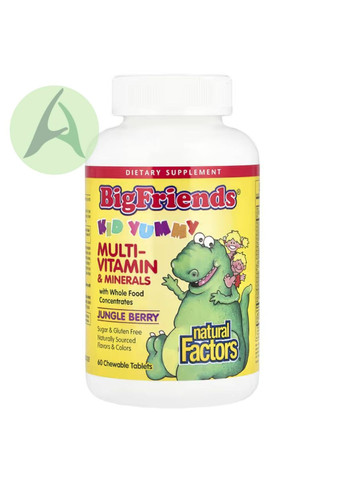 * Дієтична добавка| * Містить концентрати з цілісних продуктів| * Не містить цукру та глютену| * Натуральні барвники й ароматизатори| * Підходить для вегетаріанців| * Чистота та ефективність гарантовані| Жувальний мультивітамінний комплекс«Великі друзі» — комплексна та смачна жувальна полівітамінна та мінеральна формула, що підсолоджена ксилітом, здоровою альтернативою для дітей без цукру, яка не шкодить зубам. Створений для підтримки міцного здоров’я активних та зростаючих дітей віком від 3 років. Допомагає у розвитку та підтримці здоров'я кісток, зубів, ясен, шкіри, оболонок. Підтримує зір, нічне бачення, а так само імунну функцію.| | РЕКОМЕНДАЦІЇ ІЗ ЗАСТОСУВАННЯ| Дітям від 3 років: розжовувати по 1 таблетці 1–2 рази на день або відповідно до рекомендацій лікаря.| | ІНШІ ІНГРЕДІЄНТИ| Мальтодекстрин, мікрокристалічна целюлоза, натуральні ароматизатори, лимонна кислота, стеарат магнію (рослинного походження), червоний барвник (аравійська камедь, овочевий сік (барвник), мальтодекстрин, лимонна кислота).| Містить сою.| Без штучних барвників, консервантів, підсолоджувачів, молочних продуктів, цукру, пшениці, глютену, дріжджів, яєць, риби, молюсків, деревних горіхів, ГМО.| | ПОПЕРЕДЖЕННЯ| Перед застосуванням будь-яких дієтичних добавок під час вагітності, планування вагітності, грудного вигодовування, прийому препаратів, підготовки до хірургічної операції або за наявності захворювань слід проконсультуватися з лікарем. Зберігати в недоступному для дітей місці. Зберігати в сухому та прохолодному місці для збереження свіжості.| | Поживна цінність| Розмір порції: 1 таблетка| Кількість в 1 порції % від добової норми для дітей віком від 3 років % від добової норми для дорослих і дітей від 4 років| Калорії 5| Усього вуглеводів 1 г < 1 %† < 1 %‡| Ксилітол Менше 1 г| Вітамін А (бета-каротин) 150 мкг RAE 50 % 17 %| Вітамін C (аскорбат кальцію та натрію) 100 мг 667 % 111 %| Вітамін D3 (холекальциферол) 5 мкг (200 МО) 33 % 25 %| Вітамін Е (у вигляді d-альфа-токоферилу сукцинату) 8 мг 133 % 53 %| Вітамін К2 (менахінон, МК-7) (боби натто) 2,5 мкг 8 % 2 %| тіамін 2,5 мг 500 % 208 %| Рибофлавін 2,5 мг 500 % 192 %| Ніацин (нікотинамід) 2,5 мг 42 % 16 %| Вітамін B6 (у вигляді піридоксину гідрохлориду) 2,5 мг 500 % 147 %| Фолат (з глюкозамінової солі (6S)-5-метилтетрагідрофолієвої кислоти Quatrefolic®) 85 мкг ДФЕ 57 % 21 %| Вітамін B12 (метилкобаламін) 5 мкг 555 % 208 %| Біотин 5 мкг 62 % 17 %| Пантотенова кислота (пантотенат кальцію) 5 мг 250 % 100 %| Холін (бітартрат) 2,5 мг 1 % < 1 %| Кальцій (цитрат) 65 мг 9 % 5 %| Залізо (фумарат заліза) 2,5 мг 36 % 14 %| Магній (цитрат/малат/оксид) 32,5 мг 41 % 8 %| Цинк (цитрат) 1,5 мг 50 % 14 %| Мідь (цитрат) 0,125 мг 42 % 14 %| Натрій 10 мг < 1 % < 1 %| Цільнохарчові концентрати [виноград, гранат, полуниця, журавлина, лохина, малина, чорниця, кучерява капуста (надземна), кінза (листя), петрушка (листя), каперс (ягоди), артишок (листя), чорна редька (корінь), кульбаба (корінь) , трава ячменю, селера (насіння), буряк (коренеплід), томат] 10 мг ** **| Порошок із листя стевії 2 мг ** **| інозитол 2,5 мг ** **| † Відсоток від добової норми за умови споживання 1000 калорій на день. ‡ Відсоток від добової норми за умови споживання 2000 калорій на день. ** Добову норму не визначено. Не є значним джерелом цукру.