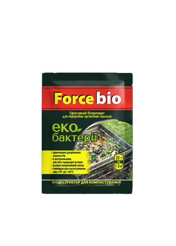 Біопрепарат для переробки компосту Force bio Біопрепарат Форсе Біо призначений для переробки органічних відходів під час компостування. Продукт виготовлений на основі комплексу живих мікроорганізмів bacillus subtilis, bacillus licheniformis, а також ферментів та продуктів їхньої життєдіяльності, які значно прискорюють процес розкладання органічних залишків у компостних ямах. Активні компоненти природного походження, потрапляючи у вологе середовище, активізуються та переробляють органічні речовини, сприяючи швидкому перегниванню скошеної трави, опалого листя та харчових відходів. Даний препарат значно зменшує обсяг відходів рослинного походження в компостній ямі та знищує насіння бур'янів. В результаті, отриманий компост стає цінним органічним добривом, придатним для внесення при посадці культур з метою підвищення врожайності, здорового росту та розвитку рослин. Переваги препарату на основі живих бактерій Форсе Біо Біодеструктор Форс Біо є екологічним продуктом без вмісту хімічних компонентів і є безпечним для навколишнього середовища Біологічний препарат переробляє всі види органічних відходів, прискорюючи процес утворення компосту Застосування біодеструктора забезпечує одержання якісного органічного добрива з органічних залишків Засіб усуває неприємні запахи та знищує насіння бур'янів Спосіб застосування: 20 г препарату Форсе біо розчинити в теплій нехлорованій воді температурою не менше 40°C об'ємом 10-30 л і дати настоятися 60 хвилин (для максимального ефекту рекомендується витримати протягом 12-24 годин), після чого перемішати неметалевим предметом. Органічні відходи, які компостуються, рівномірно полити одержаним розчином. Приблизна норма витрати: 10 л робочого розчину на 1 м3 органічної маси. Органічні відходи для компостування повинні бути легко укладені без ущільнення, що значно прискорить процес переробки.