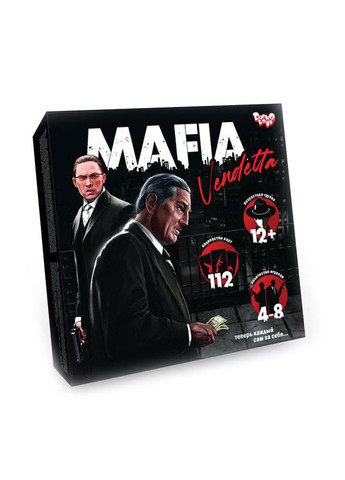 Настільна гра Danko Toys MAFIA Vendetta ДТ-БІ-07-71 Настільна гра Danko Toys MAFIA Vendetta ДТ-БІ-07-71 . Кожен гравець має свою роль: мафію, детектив, шериф або відступник. Усі, окрім шерифа, приховують свої ролі, і у кожного своя мета, що робить гру неймовірно азартною. Окрім ролей, кожен отримує карту персонажа зі своєю унікальною здатністю. Купуйте за монети нові навички, збирайте зброю, автомобіль чи казино, ховайтеся за картою-укриттям – робіть все, щоб перемогти, адже тепер кожен сам за себе! Характеристики: Тип: настільна гра Вік: віком від 16 років Матеріал: картон Кількість дизайнів: 1 Кількість гравців: 4-8 Колір: різні кольори Упаковка: картонна коробка Виробник: Danko Toys Комплектація: Карти: 112 шт Планшетка: 8 шт Фішка: 100 шт Кубик: 1 шт