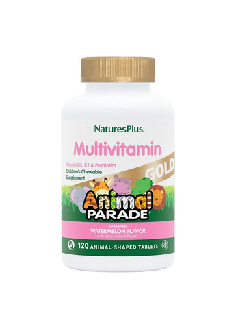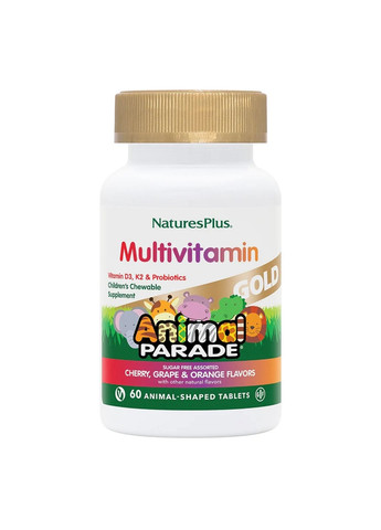 Відправка протягом 2-4 робочих днів. Natures Plus Animal Parade Gold - це одна з найпопулярніших добавок для дітей, що містить мультивітаміни та мікроелементи! З цими вітамінами ваша дитина отримає те, що не може отримати в повному обсязі від звичайної їжі. Особливості: Дієтична жувальна добавка для дітей з мультивітамінами та мікроелементами. Містить вітамін D3, вітамін K2, пробіотики та органічні цільно-харчові продукти Веганський продукт У складі представлений широкий спектр вітамінів і мінералів, а також пробіотики та пребіотики. Призначення: Підтримка здоров `я кісткових тканин Підтримка здоров `я травної системи Підтримка здоров `я імунної системи Підтримка вироблення природної енергії Як приймати Як добавку давати дітям по дві жувальні таблетки щодня. Для дітей від 3 років. Вміст елементів у 1й порції 2 таблетки Калорії 10 ккал Вуглеводи 2 г Ксилитол 2 г Вітамін A (у вигляді бета-каротину) 1500 мкг Вітамін C (аскорбінова кислота) 60 мг Вітамін D3 (холекальциферол із лишайника) 13 мкг Вітамін E (d-альфа токоферилацетат) 20 мг Вітамін K2 (менатетренон) 40 мкг Вітамін В1 (гідрохлорид тіаміну) 1,5 мг Вітамін В2 (рибофлавін) 1,7 мг Вітамін В3 (нікотинамід) 20 мг Вітамін В4 (холін бітартрат) 0,01 мг Вітамін В5 (пантотенат кальцій) 10 мг Вітамін B6 (гідрохлорид піридоксин) 2 мг Вітамін В7 (біотин) 50 мкг Вітамін В9 (фолат) (L-5-метилтетрагідрофолат кальцію) 17 мкг - фолієва кислота (L-метилфолат) 10 мкг Вітамін B12 (метилкобаламін) 6 мкг Залізо (аміноатний комплекс) 5 мг Йод (бурі водорості) 100 мкг Калій (аміноатний комплекс) 1 мг Кальцій (аміноатний комплекс) 50 мг Магній (аміноатний комплекс) 10 мг Марганець (аміноатний комплекс) 1 мг Мідь (аміноатний комплекс) 1 мг Селен (селеніт натрію) 35 мкг Хром (піколінат хрому) 60 мкг Цинк (аміноатний комплекс) 3 мг Лютеїн (екстракт чорнобривців) (квіти) 0,5 мг Лимонний біофлавоноїдний комплекс (Citrus limon) 0,2 мг Lactobacillus acidophilus (3.5 million viable cells) 0,25 мг Lactobacillus plantarum (2.5 million viable cells) 0,25 мг Streptococcus thermophilus (10 млн. viable cells) 0,25 мг Комплекс незамінних жирних кислот 2 мг - альфа-лінолева, лінолева, олеїнова, пальмітинова жирні кислоти (зі соняшнику, льону, спіруліни) Суміш ферментів 1,4 мг - амілаза, лактаза, ліпаза, бромелаїн (з ананаса), папаїн (з папаї), ​​целюлаза, протеаза Інгредієнти Ксилітол, натуральні ароматизатори, карбонат кальцію, лимонна кислота, магнію стеарат, гуарова камедь, натуральний барвник (виноград, буряк, анато), стеаринова кислота, сертифікована за стандартом Organic Gold Standard суміш цілісних продуктів (органічне яблуко, кукурудза гриб. паростки цвітної капусти, паростки кучерявої капусти, паростки броколі, коренеплід моркви, шпинат, томатний сік, спіруліна, хлорела, петрушка, лохина, екстракт ацероли, буряковий сік, гриба міцелій гриб, чорниця, броколі, цвітна , оксид цинку, шипшина, плоди папаї, рисові висівки, плоди мальпігії (Malpighia glabra), морква, плоди манго, шпинат, броколі, яблучний пектин. Утримує підсолоджувач ксилітол, який може знижувати ризик появи карієсу, на відміну від цукрових підсолоджувачів. Залежно від смаку склад може відрізнятися. Виробник: Natures Plus; Форма випуску: Жувальні таблетки; Кількість в упаковці, шт: 60; Кількість порцій, шт: 30; Зміст порції: 2 жувальні таблетки; Комплекси вітамінів та мінералів: Вітамінно-мінеральні; Добавки: Рослинні компоненти, Травні ферменти, Пробіотики; Пол: Жіночий, Чоловічий; Вікова категорія: Дитячі; Країна виробника: США; Призначенн