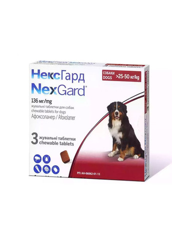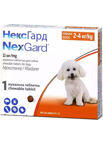 NexGard Spectra (НексГард Спектра) Таблетка від бліх, кліщів та глистів для собак від 7,5 до 15 кг Комбінований протипаразитарний препарат у вигляді жувальних таблеток зі смаком яловичини для собак, вагою від 7,5 до 15 кг. Захищає вихованця від бліх, іксодових кліщів, шлунково-кишкових нематод та личинок дирофілярій на термін до 1 місяця. Призначення: Для лікування профілактики зараження бліхами: Ctenocephalides felis, Ctenocephalides canis Для профілактики зараження іксодовими кліщами: Dermacentor variabilis, Dermacentorreticulatus, Rhipicephalus sanguineus, Ixodes scapularis, Ixodes ricinus, Ixodes holocyclus, Haemaphysalis longicornis, Amblyomma americanum Для профілактики зараження шлунково-кишковими нематодами: Toxocara canis, Toxascaris leonina, Ancylostoma caninum, Ancylostoma braziliense, Trichuris vulpis Для профілактики зараження личинками дирофілярій: Dirofilaria immitis Механізм дії: Афоксоланер-інсектоакарицид групи ізоксазоліну блокує ГАМК-залежні рецептори членистоногих, а також створює гіперзбудження нейронів, порушення передачі нервових імпульсів, що призводить до паралічу та загибелі паразитів. Афоксоланерлегко всмоктується в шлунково-кишковому тракті і досягає системного кровотоку, його максимальна концентрація в плазмі відмічена через 2-4 години після прийняття таблетки. Виводиться з організму переважно з жовчю і незначно із сечею. Період напіввиведення афоксоланера становить 14 діб. Мільбеміцинаоксим - макроциклічний лактон, який активний щодо гельмінтів - личинок та імаго нематод, що паразитують у шлунково-кишковому тракті собак, а також личинок Dirofilaria immitis. Дія мильбеміцину виражається підвищенням проникності клітинних мембран для іонів хлору, що призводить до надполяризації мембран клітин нервової та м'язової тканини, паралічу та загибелі паразиту. Максимальна концентрація мильбеміцину оксиму в плазмі собак досягається протягом 1-2 годин. Виводиться з організму в основному в незміненому вигляді, період напіввиведення становить близько 1,5 діб. Чому варто купити? Виготовлено на основі двох активних компонентів: афоксоланера та мильбеміцину, які забезпечують широкий спектр протипаразитарної дії щодоектопаразитів та гельмінтів у собак Випускається у вигляді апетитних жувальних таблеток зі смаком та ароматом яловичини, завдяки чому таблетки охоче поїдаються собаками Починає діяти через 30 хвилин після застосування, один прийом препарату гарантує знищення бліх за 6 годин, а іксодових кліщів за 8-12 годин Результативно бореться проти найпоширеніших видів гельмінтів: аскарид, власоголов і анкілостом, а також запобігає повторному зараженню бліхами протягом 1 місяця Вироблена на рослинній основі із соєвого протеїну, не викликає у вихованця алергію на тваринні білки Не має обмежень у купанні, тісному контакті з собакою, миття шампунем до та після застосування препарату В рекомендованих дозах не має тератогенних, ембріотоксичних, мутагенних властивостей, не надає місцево-подразнюючої дії Ефективність лікування генералізованого демодекозу та саркоптозу у собак – 99% Можна застосовувати як з кормом, так і окремо Як використовувати NexGard Spectra Таблетки від бліх, кліщів та глистів для собак від 7,5 до 15 кг Застосовують собакам індивідуально перорально одноразово в мінімальній дозі 2,5 мгафоксоланера та 0,5 мг мильбеміцину оксиму на 1 кг маси тварини. 1 таблетка для собак, вагою від 7,5 до 15 кг містить 37,5 мг афоксоланера і 7,5 мг мильбеміцину оксиму. Маса таблетки 2 грам