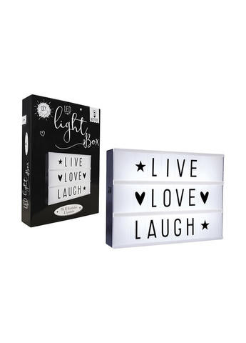 Дуже стильний і цікавий світлодіодний лайтбокс, виготовлений із пластику. Білого кольору з чорними написами - "live", "love" та "laugh". Функціональний та стильний декор для кав'ярень, кафе і ресторанів - навіть для шоу-румів і магазинів. М'яке освітлення і незвичайний дизайн стане прикрасою для комерції або домашнього використання. Світильник має розміри 30х22х5см (формат А4), 85 елементів і 10 світлодіодів. Упакований в подарункову упаковку - як варіант подарунка на день народження, новосілля або Новий Рік. Кількість в упаковці 1 шт. Кількість в ящику 1 шт.