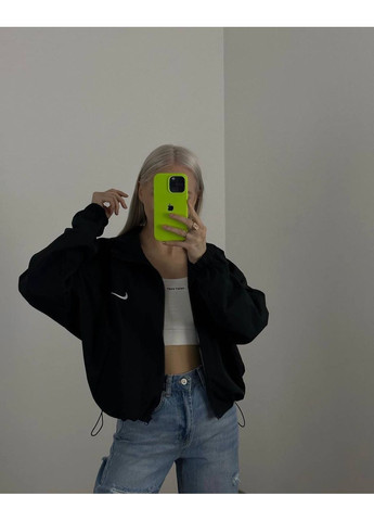 Вітровка Тканина - плотна плащовка Розміри - 42-46 oversize Кольори -чорний Стильна чорна вітровка, виконана з тканини плащівка — функціонального матеріалу, який захищає від вітру та легкого дощу. Вітровка має укорочений фасон і вільний крій, що створює трендовий street-style образ. Модель доповнена: застібкою-блискавкою по центру, еластичними манжетами на рукавах, стяжками по низу, які дозволяють регулювати посадку. На грудях розташований мінімалістичний логотип Nike, що підкреслює спортивний характер речі. Плащівка має гладку поверхню, легко чиститься та чудово підходить для активного міського життя.