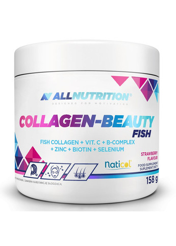 ALLNUTRITION COLLAGEN-BEAUTY FISH дієтична добавка у формі порошку для розчинення та запивання зі смаком полуниці, яка поєднує унікальний гідролізований рибний колаген Naticol® з комплексом необхідних вітамінів та мінералів. Він створений для людей, які піклуються про здоров'я, регенерацію та гарний зовнішній вигляд, а також для всіх, хто хоче комплексно піклуватися про свій організм зсередини. ЧОМУ ALLNUTRITION COLLAGEN-BEAUTY FISH? МОРСЬКА СИЛА КРАСИ З NATICOL® Naticol® - це лінійка морських пептидів колагену природного походження. Завдяки використанню унікального процесу ферментативного гідролізу, отримані пептиди колагену характеризуються високою біодоступністю [1]. Клінічні дослідження, проведені відомим виробником Weishardt, показали його позитивний вплив на красу - уповільнення видимих ефектів старіння шляхом підвищення еластичності шкіри та зменшення зморшок [2]. МІЦНІ ТА ПОТУЖНІ СУГЛОБИ Люди потрапляють у замкнене коло сидячого способу життя: захворювання суглобів перешкоджають фізичній активності та зберігаються за її відсутності. Клінічні дослідження формули Naticol® підтвердили позитивний вплив на здоров'я суглобів, шляхом покращення їх комфорту та підвищення фізичної працездатності, витривалості та м'язової сили [3]. ПІДТРИМКА ТРАВЛЕННЯ Naticol® - це інгредієнт, що складається з морських пептидів колагену зі специфічними маркерами, запатентований за його вплив на кишковий комфорт, таким чином збільшуючи кількість захисних бактерій [4]. КРАЩА ЗАСВОЮВАНІСТЬ - БІЛЬША ЕФЕКТИВНІСТЬ У процесі гідролізу колаген розщеплюється на менші пептиди, які легше засвоюються та утилізуються організмом. Ось чому гідролізований колаген так високо цінується як у харчових добавках, так і в косметології. Крім того, рибний колаген складається переважно з колагенових волокон I типу, з яких побудовано близько 90% колагенових білків в нашому організмі, тому він має найкращу біодоступність серед інших джерел колагену. Рибний колаген набагато менш зшитий, ніж інші колагени, що сприяє його кращій розчинності. Ефективність продукту посилена іншими активними речовинами, наприклад, вітаміном С, який впливає на вироблення колагену, необхідного для здоров'я шкіри, зубів і кісто [5]. ЗДОРОВ'Я ТА КРАСА Біотин допомагає підтримувати здорову шкіру та волосся. Крім того, він підтримує правильні психологічні функції [6], допомагаючи підтримувати гарне самопочуття. Селен не тільки підтримує стан волосся та нігтів, але й відіграє ключову роль у функціонуванні щитовидної залози та імунної системи [7]. Цинк не тільки піклується про здорове волосся, нігті та шкіру, але й підтримує кістки [8]. ЕНЕРГІЯ ТА РЕГЕНЕРАЦІЯ Тіамін підтримує правильне функціонування серця та нервової системи [5], а вітамін В6 додатково підтримує імунітет та допомагає регулювати гормональну активність [9]. Ніацин допомагає підтримувати здорову шкіру і в поєднанні з вітаміном С сприяє зменшенню відчуття втоми і втоми [10], надаючи вам енергію на цілий день. Відкрийте для себе секрет краси та здоров'я вже сьогодні з ALLNUTRITION COLLAGEN-BEAUTY FISH! NATICOL® ДЛЯ КРАСИВОЇ ШКІРИ, ЗДОРОВИХ СУГЛОБІВ ТА ПІДТРИМКИ ТРАВЛЕННЯ ПІДТРИМКА ВИРОБЛЕННЯ КОЛАГЕНУ ВІТАМІНАМИ C БІОТИН, ЦИНК І СЕЛЕН ДЛЯ ЗДОРОВ'Я ШКІРИ, ВОЛОССЯ ТА НІГТІВ РЕГЕНЕРАЦІЯ ТА ЕНЕРГІЯ ЗАВДЯКИ ТІАМІНУ ТА НІАЦИНУ СЕЛЕН, ВІТАМІН С І B6 ДЛЯ ЗМІЦНЕННЯ ІМУНІТЕТУ 27 ПОРЦІЙ В УПАКОВЦІ ЕФЕКТИ, ПІДТВЕРДЖЕ