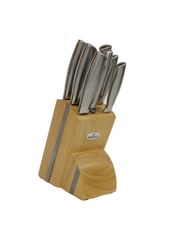 Набір ножів завжди знадобиться на кухні. Всього в комплекті сім кухонних аксесуарів: ніж для овочів, універсальний, кухарський, для хліба та ніж для нарізки, ножиці, мусат. Ножі відрізняються розмірами та призначенням, при цьому виконані в ідентичному оформленні. Виготовлений набір із міцної та екологічно чистої нержавіючої сталі. Ергономічні ручки зручно тримаються в руці та не ковзають під час роботи з ними. Леза гострі, легко підточуються за потреби. Також вироби легко відмиваються після використання, на це не йди багато часу. У наборі є підставка для ножів та інших аксесуарів, що йдуть у комплекті.