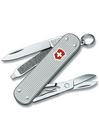 Victorinox Classic ALOX 0.6221.26 – мініатюрний складаний ніж, що вміщає в себе цілий набір корисних інструментів. У конструкції компактного мультитула передбачено лезо з гладкою робочою поверхнею (Plain), яке відмінно ріже різні матеріали. Також у даній конструкції є ножиці і пилка для нігтів з очищувачем, який може грати роль плоскої міні викрутки. Кількість функцій: 5 Довжина у складеному вигляді: 58 мм Довжина леза: 34 мм Вага: 21,2 г Колір: сріблястий Марка сталі: X55CrMo14 Тип замку: Slip-joint Матеріал рукояті/накладок: алюміній