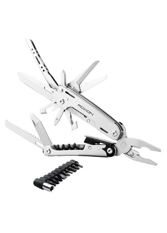 Модель Roxon STORM S801S створена за принципом класичних мультитула. Роль головного інструменту в ньому виконують плоскогубці. Вони додатково оснащені захопленням для круглих предметів і функцією кусачок. Всі інші інструменти розміщуються всередині двох металевих ручок. В тому числі, користувачам доступні пила, невеликий напилок, край якого використовується як пряма викрутка, відкривачка і штопор, склобій. Всі перераховані інструменти знаходяться в одній рукоятці, а в іншій розміщені ніж з гладко заточеним лезом, стропоріз, консервний ніж, шило, посилені ножиці, лінійка, тримач для біт, який виступає також у якості хрестоподібної викрутки. Ще більше функціональність Roxon STORM S801S розширюється за рахунок набору біт і перехідника для них. Це, свого роду, комплект компактніх викруток різної форми, з допомогою яких можна відкрутити будь гвинт. Всі біти зберігаються в одному чохлі, що не дозволяє їм загубитися. Набір біт, як і сам мультитул, поміщається в нейлоновий чохол, який продається разом з мультиинструментом. Цей чохол захистить мультитул від бруду і подряпин. Він дуже зносостійкий і легко пертися, коли це потрібно. Roxon STORM S801S повністю виготовлений з нержавіючої сталі 420. Це поширена марка металу з високим рівнем корозійної стійкості і хорошими показниками міцності. Зроблені з неї інструменти підходять для повсякденного використання, подорожей, поїздок на риболовлю. За ними не доведеться дуже ретельно доглядати: досить містити мультитул у чистоті. Модель Roxon STORM S801S має довжину в складеному стані 106 мм. Ширина мультитула дорівнює 41 мм, а його товщина – 20 мм. Вага інструменту 313 г. Його цілком можна носити просто у кишені, щоб використовувати при кожній потребі. Особливості: повнорозмірний мультитул; матеріал ножиці і леза ножа покращено з нержавіючої сталі 3Cr13 до нержавіючої сталі 5Cr15, твердість до 56-58 HRC; додано замок на пилку (liner lock), безпечніше використання; додано замок тип Safe Lock на ніж; товщина ножа збільшена на 20% - старий 1,8 мм, новий 2,2 мм; загальна кількість функцій – 16; матеріал – сталь 420; в комплекті є набір біт; мультитул продається з нейлоновим чохлом; інструмент важить 313 г; габарити складеного мультитула складають 106х41х20 мм. Гарантія: На мультитули Roxon STORM S801S діє гарантія виробників на 10 років.