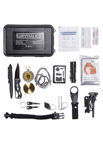 Тактичний набір для виживання - ідеальний комплект для активного відпочинку, походів, кемпінгу та подорожей. Він стане незамінним помічником в екстремальних умовах і в автомобілі, допомагаючи впоратися з несподіваними ситуаціями і забезпечуючи максимальну безпеку. Компактний і зручний, набір містить усе необхідне для виживання, включно з інструментами, освітленням, засобами для розпалювання вогню, риболовлі та надання першої допомоги. Завдяки міцному тканинному кейсу його можна легко закріпити на рюкзаку або поясі, що робить цей набір універсальним для будь-якого користувача. Основні характеристики: Розмір: 21х15х12 см; Матеріал кейса: тканина. Комплектація туристичного набору: тактична саперна лопатка; кемпінговий мультитул; туристичний ніж; універсальна ложка; мультитул-карта; тримач для пляшки на пояс; паракордовий браслет 6 в 1 (свисток, кресало, компас, скребок); похідний мультитул (ложка-вилка-ніж, свисток); ліхтарик; набір для розпалювання багаття (кресало, трут); паракордовий шнур; карабін; нейлоновий шнур; свисток; хімічні ліхтарики; рибальське спорядження; аптечка першої допомоги (щипці, ножиці, пластирі, спиртові серветки, ватні палички, джгут, бинт, термоковдра); дротова пила; набір шпильок. Цей набір - ідеальний супутник для мандрівників, любителів екстремального відпочинку та всіх, хто хоче бути готовим до будь-якої ситуації. Компактність, надійність і продумана комплектація роблять його чудовим вибором як для особистого користування, так і як подарунок.