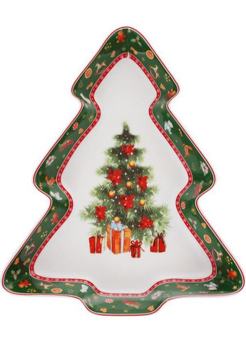 Блюдо фігурне "Ялинка" - яскравий посуд для затишного і веселого різдвяного столу. Розмір: 30.5см. Блюдо виготовлено з білого фарфору зі стійким декором новорічної тематики, по краях - зелена хвиляста кайма. Блюдо має форму ялинки. Воно послужить відмінним подарунком до Різдвяних свят або до Нового Року. Найкраща ідея оригінального позитивного і практичного подарунка в період зимової казки.