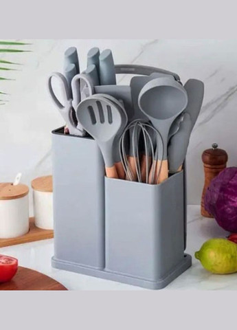 Кухонний набір Kitchenware Set - незамінний надійний помічник на Вашій кухні, включає в себе 11 необхідних аксесуарів для приготування страв, 5 ножів, кухонні ножиці, обробна дошка та підставка для зберігання. Аксесуари виготовлені з харчового, термостійкого, антипригарного силікону преміум-класу, який захищає Ваш посуд від подряпин і добре відполірованого натурального дерева, що має антибактеріальні властивості. Леза ножів та ножиць з високоякісної нержавіючої сталі. Ручки, дошка та підставка з якісного міцного поліпропілену. Безпечний для використання з харчовими продуктами, нетоксичний, без запахів, витримує температуру до 230°С. Особливості: 19 предметів: максимально широкий набір кухонних інструментів для різноманітних задач та приготування різноманітних страв. Підставка: компактна та зручна підставка для зберігання та організації всіх предметів набору. Дизайн: елегантний колір надає набору стильного та сучасного вигляду, підійде до будь-якого інтер'єру. Якісні матеріали: виготовлений із міцних та безпечних матеріалів, забезпечуючи довговічність та надійність. Різноманітність інструментів: включає лопатку, вінчик, шумівку, ніж, ножиці та багато іншого для різних кулінарних завдань. Зручність використання: ергономічні ручки та функціональний дизайн забезпечують комфорт та легкість у використанні. Легкість у догляді: легко миються та підтримуються в чистоті для довговічності та гігієни. Універсальність: набір підходить для різних кулінарних стилів та може використовуватись у будь-якій кухні. Комплектація: Пензлик - для рівномірного розподілу масла на сковороді, деку або маринівки м'ясаЩипці - для сервування або приготування їжіВінчик - для змішування соусів, збивання яєць, вершків і кремуЛожка з прорізом - для приготування і проціджування супів, соусівОполоник - для подачі супу, рідких страв і соусівЛожка для спагетті - для приготування та подавання спагеттіСервувальна ложка - для приготування та подавання супівЛопатка з прорізом - для смаження і сервування з проціджуваннямЛопатка - для перемішування, смаження, приготування на грилі та сервування їжіЛожка для салату - для перемішування і подачі салатів Лопатка для нанесення - для розподілу масла, джему та іншогоНіж шеф-кухаря 8 дюймів - універсальний для повсякденного використання, подрібнення, нарізки скибочками, кубиками м'яса, овочів, фруктів та хлібаНіж для нарізки 8 дюймів - довге вузьке лезо ідеально підходить для нарізки м'яса, птиці, копченої та приготовленої рибиНіж для хліба 8 дюймів - надгостре лезо з шипами дозволяє легко розрізати хліб, забезпечуючи гладку та чисту поверхнюУніверсальний ніж 5 дюймів - для нарізки продуктів твердої та м'якої текстури, ідеально підходить для бутербродів та овочів, не роздавлюючи і не ушкоджуючи м'яку внутрішню частинуНіж для чищення овочів 3 дюйми - ідеально підходить для очищення шкірки, нарізки невеликих інгредієнтів для страв Кухонні ножиціДошка для нарізанняПідставка для зберігання