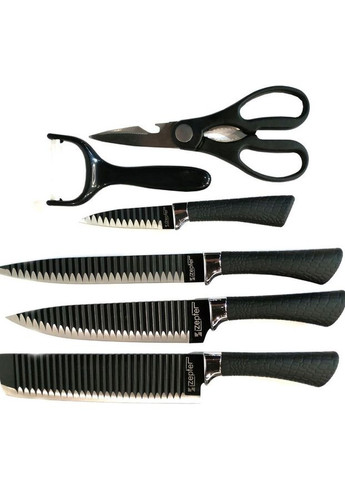 Набір кухонних ножів Zepter ZP-007 6в1 (А1108) Набір кухонних ножів виготовлений з нержавіючої сталі та має мармурове покриття. Ножі мають підвищену твердість через великий вміст у складі вуглецю, молібдену та ванадію. Ножі від Zерter набагато рідше тупляться і мають великий термін експлуатації. Набір чудово підійде на роль подарунка, всі предмети комплекту виконані в єдиному стилі та кольорі. Ножі упаковані у привабливу коробку, що має презентабельний вигляд. Переваги: Ребриста поверхня ножів сприяє зручній нарізці без прилипання продуктів Ножі невибагливі у догляді, їх якісне полотно впорається з обробкою будь-яких продуктів. Спеціальне покриття не дає бактеріям залишатися на лезі ножів, а значить вони не потраплять у вашу їжу. Ручка виготовлена ​​із пластмаси ПОМ із наконечником із нержавіючої сталі Гострі, рельєфні леза Комфортні в роботі, практичні ножі сподобаються як кухарям, так і домогосподаркам Склад набору: Ніж шеф-кухаря – 1 шт. Ніж для м'яса – 1 шт. Ніж для подрібнення – 1 шт. Ніж для чищення овочів – 1 шт. Ножиці – 1 шт. Овочечистка - 1 шт. Характеристики Набір кухонних ножів Zepter ZP-007 6в1 (А1108) Колір виробника Тип ніж Призначення ножа для грибів, для картоплі, для нарізки, для фігурної нарізки, для фруктів, для авокадо, для зелені, для птиці, для сиру, для томатів, для яблук, універсальний Серія ProLine Leifheit Матеріал леза нержавіюча сталь Бренд Zepter Країна-виробник Китай Упаковка картонна коробка Матеріал ручки нержавіюча сталь