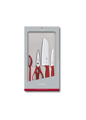 Кухонний набір Victorinox Swiss Classic Kitchen Set 6.7131.4G - ідеальне кухонне приладдя для всіх ваших повсякденних кулінарних завдань. Різноманітність інструментів та комплектації серії Swiss Classic (Свісс Класік) дозволяють виконувати широкий спектр робіт на кухні легко та максимально комфортно. В універсальний набір для кухні входить 4 інструменти: кухонні ножиці з нержавіючої сталі – багатоцільовий інвентар. Леза виготовлені з виключно твердої нержавіючої сталі з мікрозубчастим різальним краєм, щоб ефективно утримувати предмет/продукт, що розрізається на місці. Конструкція ручок має спеціальний отвір, призначений для розколювання горіхів або для розкриття кришок на банках, що погано відкручуються. Ручки виготовлені із міцного синтетичного пластикового матеріалу. Ножиці не рекомендується мити в посудомийній машині. ніж Santoku (сантоку). Широке лезо з рифленим краєм і довжиною 17 см. При нарізанні поглиблення на клинку мінімізують прилипання продуктів до леза. Косий кінчик леза ідеальний для нарізування кубиками, скибочками чи подрібнення продуктів на рівній поверхні. Чудово справляється з нарізкою м'яса, риби, овочів чи сиру. Рукоятка виконана з термопластичного еластомеру (ТЕП). Безпечно мити в посудомийній машині. Вага ножа: 140 г. ніж для очищення та нарізки. Ідеально підходить для фруктів та овочів з м'якою шкіркою; для намазування кремоподібних продуктів. Можна використовувати під час сервірування столу. Швейцарський ніж із серрейторним лезом 11 см. Вага ножа: 33 грами. Ручка зроблена з поліпропілену. універсальна овочечистка. Ідеально підходить для фруктів та овочів з м'якою або твердою шкіркою. Швейцарський ніж для очищення з ультрагострою зубчастою ріжучою кромкою та ергономічною ручкою для простоти використання. Рукоятка із поліпропілену. Можна мити в посудомийній машині. При виготовленні ріжучих поверхонь використана високоякісна нержавіюча прокатна сталь, здатна витримувати значні повсякденні експлуатаційні навантаження. Завдяки технології поетапного загартування і подальшого шліфування нержавіючий сплав Вікторінокс має унікальні антикорозійні властивості. Набір з багатофункціональних ножів, овочечистки та кухонних ножиць поставляється з фірмовою подарунковою коробкою.