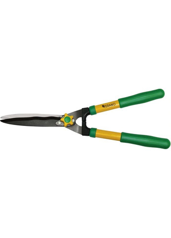Садові ножиці довжиною 625 мм, леза 230 мм х 4,0 мм являють собою секатор з двома ріжучими лезами, які працюють за принципом звичайних ножиць. Хвилясті леза із сталі, верхнє з PTFE покриттям (проти налипання), упор для полегшення віддачі від рукояток в процесі різу. Регульований зазор між лезами. Гайка баранчик перешкоджає мимовільному розкручуванню лез. Довгі металеві пофарбовані рукоятки з м'якими гумовими накладками забезпечують природне положення тіла під час роботи. Ножиці призначені для стрижки живоплоту, тонких гілок. Вони дозволяють проводити зрізання пучками трави і можуть використовуватись для збору фруктів та винограду. Це універсальний інструмент, без якого не обійтися професійному садівнику або ландшафтному дизайнеру.