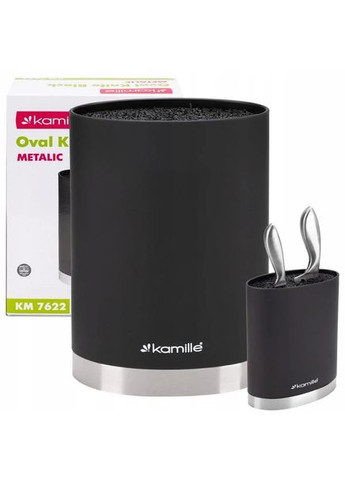 Універсальна блок-підставка для ножів із наповнювачем Kamille дає змогу максимально дбайливо зберігати кухонні ножі та ножиці в одному місці, так щоб вони завжди були під рукою. Корпус підставки виготовлений із міцного та безпечного харчового пластику, з приємним на дотик і оку покриттям soft-touch. Внутрішній блок складається з тонких і гнучких поліпропіленових стрижнів, які не шкодять лезам. За потреби наповнювач вільно виймається й миється в посудомийній машині. Такий тримач підходить як для звичайних металевих, так і для керамічних ножів і не дасть їм затупитися, а головне допоможе вам тримати всі ваші улюблені інструменти під рукою! Потіште себе та своїх близьких красивим, універсальним і головне — корисним подарунком! Підставка для ножів Kamille KM 7622 Матеріал корпусу: пластик із soft-touch покриттям. Форма: овальна. Розмір: 16х7х22 см. Колір: чорний зі вставкою з неіржавкої сталі. Особливості: сучасний стильний дизайн; корпус із зовнішнім покриттям «soft-touch»; корпус рекомендується мити вручну; поліпропіленовий наповнювач можна мити в посудомийній машині.