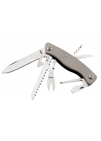 Багатофункціональні ножі Grand Way чудово підійде як мисливцям, рибалкам і туристам для використання в умовах дикої природи, так і міському обивателеві для щоденного носіння. Незважаючи на компактні габарити і невелика вага, ножі включають в себе цілий набір інструментів затребуваних в умовах міста і природи. Ніж, штопор, викрутки, шило, пила, ножиці - це далеко не весь перелік функцій, які можуть виконувати ножі. У топових моделях багатофункціональних ножів Grand Way кількість інструментів може досягати 16 одиниць. У неробочому положенні інструменти складаються в порожнину рукояті. Конструкція ножів опрацьована до дрібниць, вони просто незамінні в походах і подорожах. Багатофункціональний ніж буде прекрасним подарунком для будь-якого чоловіка, який любить сучасні, практичні речі. Замок клинка: Slip Joint Тип стали клинка: Сталь 420 (52-55 HRC) Материал рукояти: Металл Длина лезвия: 85 мм Довжина в розкладеному положенні: 195 мм 10 функцій: ніж з прямою заточкою, пилка по дереву, ножиці, відкривачка для пляшок і банок, шило, штопор, плоскі викрутки, хрестова викрутка, кільце для підвісу