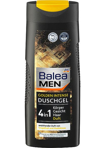 Гель для душу 4в1 від бренда Balea ? це універсальний б’юті-засіб для догляду за тілом, обличчям і волоссям. Він ефективно очищає волосяний і шкірний покриви від різних забруднень, надлишку себуму та ароматизує тіло нотами грейпфрута й мускатного горіха. Продукт не містить мікропластику та водорозчинних, чисто синтетичних полімерів, аби кожна ваша гігієнічна процедура приносила максимум користі. Особливості Balea Men Golden Intense 4in1: - розчиняє і змиває з усього тіла будь-які забруднення;- зволожує та живить шкірний покрив;- покращує пружність ті загальний вигляд епідермісу;- позбавляє шкіру лущення;- бореться з ознаками старіння шкірного покриву, запобігає зниженню його еластичності;- утримує нормальний pH-баланс епідермісу;- проявляє омолоджувальні, відбілювальні й антибактеріальні властивості;- пляшечка виготовлена ??на 96% з переробленого матеріалу, інгредієнти гелю класифікуються як біорозкладні на 99%.