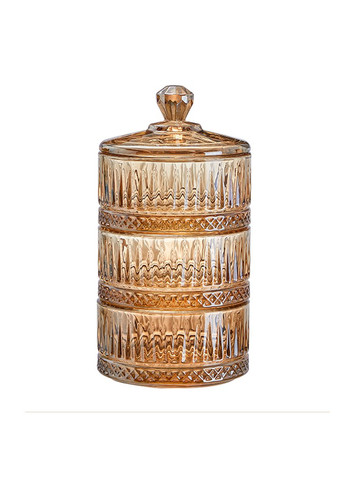 Цукерниця трирівнева скляна має висоту 20 см і діаметр 10 см. Виготовлена з прозорого скла з ребристою текстурою, що надає виробу класичного вигляду та декоративної привабливості. Конструкція включає три рівні, що дає змогу зручно розміщувати різні види цукерок, печива чи інших дрібних солодощів. Кришка щільно прилягає до верхнього рівня, забезпечуючи захист вмісту від пилу та сторонніх запахів. Завдяки вертикальному компонуванню цукерниця займає мінімум місця на столі, залишаючись місткою. Гладка внутрішня поверхня полегшує догляд і очищення. Виріб підходить для сервірування цукерок, горіхів, сухофруктів та інших кондитерських виробів. Ідеально вписується в домашній інтер'єр або для використання на святкових заходах. Дозволяє миття в посудомийній машині. Характеристики: Матеріал: товсте скло Форма: кругла Дизайн: ребристий Розміри: висота 20 см, діаметр 10 см Кришка: так Можливість миття в посудомийній машині: так