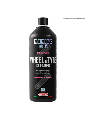 Очисник коліс і шин Mafra's Maniac LineTM — це продукт, який ефективно розчиняє зимовий дорожній бруд і пил із гальм, шин і всього колісного відсіку. Продукт можна наносити на диски автомобілів, де накопичується гальмівний пил. На шини, на які нанесені шари раніше нанесених поліролей і дорожнього бруду, можна нанести засіб для очищення коліс і шин і підготувати автомобільну шину до подальшої фази полірування або зачищення. Завдяки утворенню потужної змащувальної піни та чудової очисної дії продукту його також можна наносити всередині колісного відсіку, де дуже часто є великий дорожній бруд. Завдяки безпеці використання продукт можна наносити на будь-який тип обода та на будь-який тип шин, наприклад, історичні, з білими смугами або спортивні та позашляхові. Застосування засобу Wheel&Tire Cleaner, що видаляє бруд, дає змогу прискорити подальші операції, знижуючи ризик пошкодження кузова на етапі мийки. Продукт має солодкий і приємний аромат. Ніколи не використовуйте на гарячих поверхнях і ніколи не дозволяйте продукту висохнути на поверхні. Не використовувати на алюмінієвих, анодованих і легкосплавних дисках. Не для використання на мотоциклах. Як використовувати Продукт дуже універсальний і піддається різним розведенням: Для екстраординарного очищення: використовуйте засіб, розведений до 1:3 залежно від стійких забруднень; Для зимового бруду: Розвести 1:5 (1 частина продукту на 5 частин води); Для літнього бруду: Розвести 1:10 (1 частина продукту на 10 частин води). Нанесіть розчин безпосередньо на оброблювану поверхню; Залиште продукт діяти від 2 до 5 хвилин; Обробіть засіб пензлем або пензлем, поки не дістанете прихованих ділянок; Змивати. Для отримання змащуваної піни, що легко обробляється: Дозуйте за допомогою ручного насоса Nebula Foam. Скористайтеся перевагами мийки високого тиску на етапі полоскання. Wheel&Tire Cleaner вирізняється універсальним розведенням, продукт можна використовувати: Чистий розведений до 1:3 в разі стійких забруднень Розбавте 1:5 для зимового бруду. Розбавте 1:10 для літнього бруду.