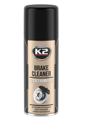 Очисник гальмівної системи K2 Brake Cleaner 400мл (W103) K2 Brake Cleaner — це високоефективний аерозольний засіб для очищення гальмівних дисків, барабанів, супортів, муфт та інших елементів гальмівної системи. Видаляє залишки мастила, гальмівної рідини, пилу та іншого бруду, не залишаючи слідів. Ідеально підходить для використання в автомайстернях, СТО та домашнього обслуговування автомобіля. Швидко висихає, не шкодить гумовим ущільненням, пластику чи металу. Переваги: Швидкодія та глибоке очищення Потужний струмінь для важкодоступних місць Зручне використання в аерозолі Універсальність застосування