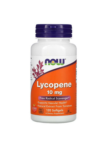 NOW Lycopene 10 mg є біодобавкою, виготовленою без компонентів ГМО, активна речовина якої лікопен – натуральний каротиноїдний пігмент, що надходить в організм людини виключно з їжею. Препарат забезпечує захист ДНК, а також є дієвим профілактичним засобом при захворюваннях очей. Лікопін сприяє уповільненню процесу розвитку атеросклерозу, запобіганню онкогенезу. Діюча речовина має антиоксидантний ефект, значно знижуючи окисний стрес. Використання БАДу дозволяє відновити та зміцнити імунітет, захистити клітини від негативного впливу різних факторів. Лікопін благотворно впливає на передміхурову залозу, бере участь у нормалізації процесів шлунково-кишкового тракту, серцево-судинної системи. Препарат побічно впливає уповільнення старіння клітин організму. Як приймати: Приймати по 1 м `якій пігулці від 1 до 3 разів на день під час їди. Вміст елементів у 1й порції 1 капсула Лікопін (натуральний екстракт помідорів) (LYC-O-TOME) 10 мг Інгредієнти Олія рисових висівок, м `яка желатинова капсула (бичачий желатин, гліцерин, вода) Виробник: NOW; Форма випуску: Капсули; Кількість в упаковці, шт: 120; Кількість порцій, шт: 120; Зміст порції: 1 капсула; Пол: Жіночий, Чоловічий; Вікова категорія: Дорослі; Країна виробника: США; Призначення: Антиоксиданти, Для імунної системи, Для органів зору, Для серцево-судинної системи