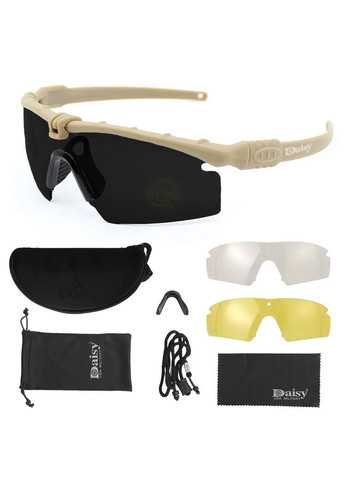 Daisy C5 Desert Storm: основні характеристики Сонцезахисні окуляри, що не б'ються, належить відомому бренду Daisy. Їх часто називають "очками НАТО". Даний оптичний виріб дуже популярний серед військових, пожежників, рятувальників та працівників охоронних систем. Успішно використовуються тактичні очки також у спорті (особливо велосипедистами), на полюванні/рибалці або під час командних військових ігор. Рівень захисту від ультрафіолету: UV400. Скло виготовлене з протиударного полікарбонату, який не ушкоджується при попаданні в нього алюмінієвої кульки 6 мм, що рухається на швидкості 300 м/с. Армійські окуляри Desert Storm надійно захистять очі не тільки від дробу та уламків, але також від вітру, пилу та піску. Анатомічна форма виробу забезпечує широкий периферійний огляд. Протиосколкові окуляри C5 комплектуються 4 парами змінних лінз різних забарвлень, які дозволяють зробити картинку чіткішою та контрастнішою при різному освітленні. Захисний оптичний прилад важить 40 г (разом із футляром – близько 283 г). Рамка чорного кольору виготовлена з ацетату целюлози – легкого матеріалу, що має гарну стійкість до механічних впливів при звичайних температурах. Щільно прилягаючи до обличчя, тактичні окуляри не викликають почуття дискомфорту. М'які вставки, які кріпляться зсередини оправи, запобігають натирання шкіри та попадання в очі дрібних частинок. Сонцезахисні окуляри для Daisy C5 оснащені лінзами наступних кольорів: - Мідно-коричневі: незамінні, якщо потрібно вести спостереження при яскравому сонячному світлі; - сірі (або повсякденні): використовуються у звичайних умовах; - прозорі MLC з багатошаровим покриттям: необхідні для спостереження у сутінках; - жовті: добрі при поганому освітленні. Кольорові лінзи з полікарбонату, будучи на кшталт фотохромними, змінюють ступінь затемнення, що безпосередньо з інтенсивністю ультрафіолетового випромінювання. Окуляри Daisy C5 міцно сидять на голові, не сповзають. Для додаткової фіксації передбачений потиличний ремінець на велкро (кріпиться до дужок). У комплект входять жорсткий футляр на блискавці і м'який мішечок, що тягнеться шнурком. Протирати скло та рамку рекомендується серветкою з мікрофібри (теж додається) або тканинним чохлом. Чистити ацетатову оправу за допомогою побутових хімічних засобів (наприклад, ацетону) не варто, оскільки це може призвести до знебарвлення.
