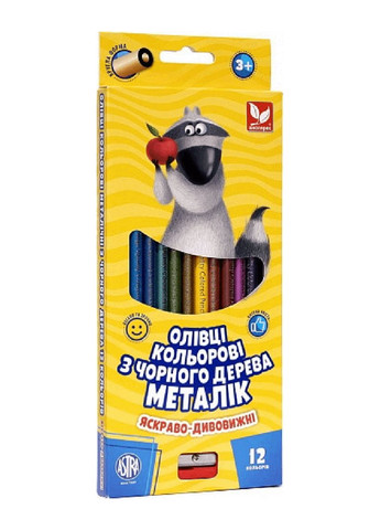 Олівці кольорові 12 шт., довжина 17,6 см, діаметр 1 см, кольори: чорний, фіолетовий, синій, зелений, рожевий, жовтий, тілесного кольору, помаранчевий, червоний, коричневий, золотий, срібний; чинка 1 шт. 2,7*1,2*1,7 см, пластик; підставка для олівців 1 шт. ПЕТ; упаковка 4+0