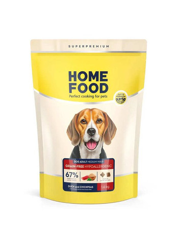 Переваги: Корм враховує особливості собак з активним способом життя. Продукти, що входять до складу корму, високо засвоювані. Рецептура включає необхідні для підтримки здоров'я комплекс вітамінів, амінокислот і Омега жирних кислот. Корм не містить консервантів, БАДів і хімічних добавок. Оновлений склад (фасування 1,6 кг, 10 кг): м’ясо ягнятини 30% (дегідратоване м’ясо ягнятини 20%, свіже м’ясо та обріз ягнятини не менше 8%, рубець та легені ягнятини (сушені та подрібнені) 2%), дегідратоване м’ясо індички 16%, рис цільнозерновий 12%, зневоднений протеїн ягнятини 8%, червона сочевиця, індичий жир 4%, цільна креветка 4% (джерело глюкозаміну), пластівці яблучні, олія лосося 3% (джерело Омега-3, Омега-6), фітоформула АМРОЛ (амарант, розторопша, льон) 3%, м’якоть буряка, жир ягнятини 2%, бета-1.3/1.6-глюкани (пребіотик), мананоолігосахариди, глюкозамін 0.5%, інулін цикорію 0.4%, хондроїтин 0.06%, куркума 0.05%, екстракт розмарину 0.05%, квіти ромашки лікарської 0.04%, квіти календули 0.04% (джерело лютеїну), листя кропиви 0.04%, псиліум (оболонка насіння подорожника) 0.04%, юка Шидигера 0.04%. Харчові добавки на 1 кг корму: вітамін А 20000 МО, вітамін D3 800 МО, вітамін Е 500 МО, вітамін С 350 мг, холіну хлорид 1500 мг, біотин 2.8 мг, вітамін В1 2.5 мг, вітамін В2 0.06 мг, вітамін В3 25 мг, вітамін В5 27 мг, вітамін В6 8 мг, В9 фолієва кислота 1.6 мг, вітамін В12 0.08 мг, цинк 95 мг, залізо 70 мг, марганець 35 мг, йод 3.2 мг, мідь 15 мг, селен 0.2 мг, L-метіонін 4000 мг, L-карнітин 200 мг. Антиоксиданти природного походження: екстракти цитруса, чорної смородини, винограду. Гарантований аналіз: сирий білок 28%, сирий жир 16%, сира клітковина 2.8%, сира зола 5.6%, кальцій 1.2%, фосфор 0.8%, вологість 10%, Омега-3 1.1%, Омега-6 3.14%, EPA 0.6%, DHA 0.3%. Енергетична цінність (калорійність) 100 г корму: 1605 кДж (384 ккал). Старий склад: м’ясо ягнятини — 31% (дегідратоване м’ясо ягнятини — 15%, свіже м’ясо та обрізь ягнятини — 10%, свіжі субпродукти ягнятини — 4% (рубець, легені, печінка, серце), сушений рубець та легені ягнятини — 2%), дегідратоване м’ясо качки, свіже м’ясо качки, рис цільнозерновий білий, м’ясний бульйон з ягнятини, свіже витоплений жир та вишкварки ягнятини, печене яблуко — 4%, рис цільнозерновий нешліфований, витяжка зі шкіри та хрящів лосося (джерело колагену та хондроїтину), фітоформула АМРОЛ (амарант, розторопша, льон), жир лосося насичений токоферолом вітамін Е (Омега-3, Омега-6), висівки рисові, пластівці яблучні, цільна червона сочевиця, свіжа цільна креветка (джерело глюкозаміну), премікс вітамінний, премікс мінеральний, м’якоть гарбуза, ФОС фруктоолігосахариди (пребіотик) корінь цикорію (джерело інуліну), ехінацея — 0.02%, квіти ромашки лікарської — 0.02%, насіння фенхелю — 0.02%, оболонка ягід шипшини — 0.02%, ягоди аронії — 0.02%, юка Шидигера — 0.01%, листя кропиви — 0.01%, чебрець — 0.01%, подорожник — 0.01%, розмарин — 0.01%, імбир — 0.01%, глюкозамін сульфат, хондроїтин сульфат, термокс. Рекомендації щодо годівлі: Привчайте тварину до сухого корму Home Food поступово. Рекомендовані норми годівлі на упаковці товару. Вказана денна норма є орієнтовною: точну кількість слід визначати відповідно до вимог, віку, рівня активності, погодних умов та особливих потреб тварини. У тварини завжди має бути миска зі свіжою, чистою водою. Зберігати у сухому прохолодному місці. Завжди закривайте упаковку після кожного годування. Активність собаки Вага собаки, кг / Кількість корму, г 1-3 3-6 6-10 10-15 15-20 20-27 27-33 33-40 40-50 