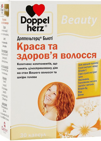 Бажаєте покращити стан свого волосся? У такому випадку вам знадобиться спеціальний німецький комплекс від бренда Doppelherz. Продукт можна використовувати в якості дієтичного харчування, як додаткове джерело міді, цинку, вітаміну С, біотину, нікотинаміду, пантотенової кислоти і B6. Олія насіння пшениці збагачене вітамінами А, F, В, PP, K, які відомі антиоксидантними властивостями, сприяють поліпшенню метаболізму в клітинах, кровообігу в волосяних фолікулах, в результаті чого пасма стають густішими, зменшується сухість шкіри, при цьому нормалізується жировий баланс. Пантотенова кислота стимулює зростання та ділення клітин, бере участь у метаболізмі жирних кислот. Вітамін B6 забезпечує формування білкових структур організму, тому його особливо потребують волосся, шкіра та нігті. Сухий екстракт хвоща багатий калієм, марганцем, алкалоїдами й флавоноїдами, які покращують кровообіг, відновлюють структуру волосся, стимулюють його зростання. Сухий екстракт сорго (просо) дає змогу утримувати вологу, тим самим відновлює водно-ліпідний баланс шкіри та пасом, що безпосередньо впливає на їхній вигляд. Цинк сприяє регуляції активності сальних залоз, необхідний для регенерації клітин, білкового синтезу й утворення колагену. Мідь бере участь у багатьох обмінних реакціях, забезпечує ріст клітин організму. Від цього залежить міцність колагенових і еластинових волокон, а значить, і сила волосся, пружність шкіри та еластичність нігтів. Крім того, нестача цього мікроелемента може призвести до передчасної сивини. Нікатиномід (вітамін PP) зміцнює коріння волосся та активізує його зростання, сприяє кращому живленню локонів, стимулює постачання волосяних фолікулів киснем, входить до складу коензимів, що беруть участь у процесах клітинного оновлення, а також відповідає за утворення пігменту в волоссі. Біотин необхідний для формування здорових нігтів і волосся, завдяки властивості зменшувати їхню ламкість, покращувати ріст, захищати від впливу навколишнього середовища. Б'юті-продукт забезпечує комплексний та цілеспрямований вплив на стан волосся й шкіри голови. Особливості Doppelherz Beauty Haar Forte Complex:- сприяє росту здорового волосся, дає змогу уникнути його випадання;- зменшує сухість епідермісу, підтримує нормальний стан клітин шкіри голови;- покращує кровообіг в зоні росту пасом;- відновлює структуру волосся, робить його гладеньким і шовковистим;- нормалізує роботу сальних залоз голови.