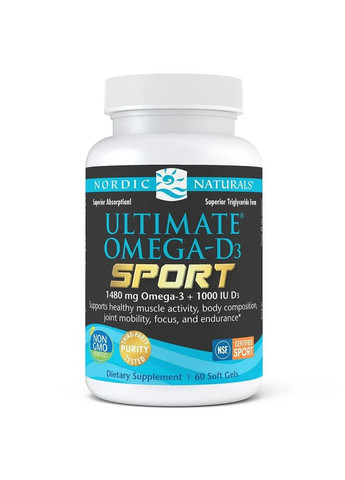 Ultimate Omega-D3 Sport Nordic Naturals — формат капсул, що містить омега-3 жирні кислоти (EPA та DHA) та 1000 МО вітаміну D3. Продукт розроблений для включення до щоденного раціону дорослих, зручний для людей з активним способом життя. До складу входить очищена риб’яча олія з анчоусів і сардин, отримана методом багатоступеневої фільтрації. Вітамін D3 представлений у формі холекальциферолу. Капсули не містять глютену, ГМО та штучних барвників. Формат підходить для щоденного використання й легко поєднується з різними режимами харчування. Основні характеристики: • омега-3 жирні кислоти EPA та DHA; • 1000 МО вітаміну D3 на порцію; • очищена риб’яча олія з анчоусів і сардин; • формат капсул, зручний для щоденного раціону; • без ГМО, глютену та штучних барвників. Рекомендації із застосування Дивитися рекомендації виробника, зазначені на етикетці. Склад Розмір порції: 2 капсули Порцій в упаковці: 30 Кількість в 1 порції % від добової норми** Калорії 20 Усього жирів 2 г 3 % Насичені жири 0 г 0 % Трансжири 0 г † Вітамін D3 (холекальциферол) 25 мкг (1000 МО) 125 % Усього омега-3 жирних кислот 1480 мг † ЕПК (ейкозапентаєнова кислота) 850 мг † ДГК (докозагексаєнова кислота) 425 мг † Інші омега-3 жирні кислоти 205 мг † ** Відсоток від добової норми за умови споживання 2000 калорій на день. † Добову норму не визначено. Менше 5 мг холестерину на порцію. Додаткові інгредієнти: очищений жир глибоководних морських риб (з анчоусів і сардин), капсула (желатин, гліцерин, вода, натуральний ароматизатор «Лимон»), натуральний ароматизатор «Лимон», d-альфа-токоферол (антиоксидант), вітамін D3 (оливкова олія, холекальциферол), екстракт розмарину (натуральний консервант). Не містить: глютену, молочних продуктів, штучних барвників і ароматизаторів. Попередження Харчова добавка. Не є лікарським засобом. Прийом добавки є доповненням до повноцінного харчування. Зовнішній вигляд упаковки може бути змінено виробником без попередження. Перед вживанням бажано отримати професійну консультацію. Не приймати, якщо захисна плівка пошкоджена або відсутня. Зберігати в сухому, прохолодному місці, захищеному від сонячних променів, у недоступному для дітей місці.