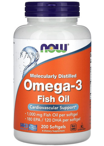 Цей концентрат риб’ячого жиру виробляється відповідно до суворих стандартів контролю якості. Він протестований на відсутність потенційно небезпечних забруднювачів (наприклад, ПХД, діоксинів, ртуті та інших важких металів). Попередні, але ще не завершені дослідження свідчать, що споживання жирних кислот омега-3 ЕПК і ДГК може знизити ризик розвитку ішемічної хвороби серця. Дія комплексу та корисні властивості: знижують рівень холестерину низької щільності та тригліцеридів у крові, перешкоджаючи розвитку атеросклерозу; поліпшують реологічні властивості крові. знижують згортання крові, перешкоджаючи виникненню тромбозів; зміцнюють стінки кровоносних судин, підтримують еластичність артерій; беруть участь у побудові всіх клітинних мембран та підтримують їх нормальний стан; необхідні для нормального розвитку та функціонування нервової системи; забезпечують передачу нервових імпульсів між нейронами, покращують пам'ять; надають протизапальний ефект; підтримують нормальний стан жирових мембран клітин шкіри, покращують стан шкіри та волосся, надають позитивний ефект при алергічних дерматитах та екземі; надають онкопротекторну дію. знижують ризик розвитку раку молочної залози та прямої кишки. є антиоксидантами. Опис Вироблено за допомогою молекулярної дистиляції Підтримка серцево-судинної системи 1000 мг риб’ячого жиру в одній капсулі 180 ЕПК і 120 ДГК в одній капсулі Почесний член організації GOED Omega-3 Без ГМО Кошерний продукт, містить желатин Сімейне підприємство, засноване в 1968 році Виготовлено на підприємстві, що має реєстрацію GMP Халяльний продукт Склад: Поживна цінність Розмір порції: 2 капсули Порцій в упаковці: 100 Кількість в 1 порції % від добової норми Калорії 20 Усього жирів 2 г 3 %** Насичені жири 0,5 г 3 %** Поліненасичені жири 1 г † Мононенасичені жири 0,5 г † Концентрат риб’ячого жиру 2 г (2000 мг) † Омега-3 жирні кислоти: Ейкозапентаєнова кислота (ЕПК) 360 мг † Докозагексаєнова кислота (ДГК) 240 мг † ** Відсоток від добової норми за умови споживання 2000 калорій на день. † Добову норму не визначено. Інші інгредієнти Капсула [бичачий желатин (без ГЕВРХ), гліцерин, вода] і d-альфа-токоферол (з соняшника). Містить рибу (анчоуси, сардини, тунець). Риб’ячий жир виготовляється з Перу, Марокко, Маврикій, Малайзія. Упаковано та протестовано на якість у США. Для виготовлення не використовуються дріжджі, пшениця, глютен, соя, молоко, яєць, молюсків, або інгредієнти з кунжутом. Виготовляється на підприємстві, яке має реєстрацію належної виробничої практики (GMP), де обробляються інші інгредієнти, що містять ці алергени. Рекомендації із застосування Приймати по 2 капсули двічі на день під час їди. Застереження при застосуванні: Тільки для дорослих. Перед початком застосування в період вагітності, грудного вигодовування, за наявності захворювань або в разі прийому препаратів слід проконсультуватися з лікарем. Зберігати в недоступному для дітей місці. Продукт може природним чином змінювати колір. Застосовувати лише згідно з інструкцією. Не слід використовувати як заміну повноцінного раціону харчування. Умови зберігання: Зберігати в сухому прохолодному місці. Країна походження товару: США. Термін придатності товару зазначений на упаковці. Дієтична добавка, не являється лікарським препаратом.