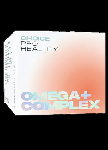 ОМЕГА+ комплекс Choice – комплексний засіб для підтримання серцево-судинної діяльності. Забезпечує організм необхідною кількістю омега-3 і омега-6, які необхідні для нормального функціонування серцево-судинної системи. Запобігає появі і розвитку гіпертонії, вегето-судинній дистонії, атеросклерозу, тромбофлебіту та інших захворювань. Містить практично всі біологічно активні речовини, необхідні для нормальної життєдіяльності організму: вітаміни, амінокислоти, ферменти, мікроелементи, макроелементи і т. д. Показання до застосування як джерело омега-3 і омега-6; при комплексному лікуванні серцево-судинних захворювань; для профілактики серцево-судинних захворювань в будь-якому віці; порушення серцевого ритму; підвищений тиск; після операцій на серці для швидкого відновлення організму. Дія нормалізує роботу серцево-судинної системи; запобігає утворенню тромбів; захищає від появи бляшок; знижує тиск; є потужним антиоксидантом; покращує пам'ять. Застосування: дорослим і дітям від 12 років по 1 капсулі 2 рази на день. Курс приймання дорослим необмежений, а дітям 30–45 днів. Можна повторити після двотижневої перерви. Повторювати 2–3 рази на рік. Склад: прозери (пророщені зерна вівса, пшениці, кукурудзи), концентрований жир хрящових риб, масло насіння льону, олія насіння гарбуза, олія зародків пшениці, пантотенова кислота. Виробник: Choice, Україна. Стаття про товар