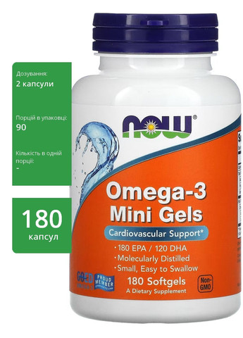 Омега-3 Now Foods (Omega-3 Mini) 180 м'яких таблеток є високоякісною добавкою омега-3 жирних кислот у зручній, мініатюрній формі капсул, розробленою спеціально для тих, хто відчуває труднощі з ковтанням капсул стандартного розміру. Цей продукт забезпечує оптимальну кількість EPA і DHA, важливих компонентів для підтримання здоров'я серця, мозку і суглобів. EPA (ейкозапентаєнова кислота) і DHA (докозагексаєнова кислота) є основними поліненасиченими жирними кислотами, які відіграють ключову роль у підтримці гнучкості та функціональності клітинних мембран по всьому тілу. Вони допомагають знизити запалення, підтримують здоров'я серцево-судинної системи, сприяють поліпшенню когнітивних функцій і зміцнюють імунну систему. Для забезпечення чистоти та безпеки, кожна партія Omega-3 Mini тестується на наявність потенційно шкідливих рівнів забруднювальних речовин, таких як важкі метали (ртуть, свинець, кадмій), діоксини та поліхлоровані біфеніли (ПХБ). Це гарантує, що ви отримуєте тільки чисті та безпечні омега-3 жирні кислоти. Особливо рекомендується для людей, які ведуть активний спосіб життя, спортсменів, а також для тих, хто хоче підтримувати оптимальне здоров'я серця, мозку і суглобів. Також омега-3 корисна для підтримки здоров'я зору та поліпшення настрою. Добавка Omega-3 Mini є ідеальним вибором для тих, хто шукає легкий спосіб включити важливі омега-3 жирні кислоти у свій щоденний раціон без незручності ковтання великих капсул. Рекомендації щодо застосування Приймати по 2 м'які таблетки 1-3 рази на день під час їди. Склад Розмір порції: 2 м'які таблетки Порцій в упаковці: 90 Кількість в 1 порції % від добової норми* Калорії 10 Усього жирів 1 г 1%* Насичені жири < 0,5 г 1%* Поліненасичені жири 0,5 г † Мононенасичені жири < 0,5 г † Концентрат натурального риб'ячого жиру 1 г (1000 мг) † Омега-3 жирні кислоти: ЕПК (ейкозапентаєнова кислота) ДГК (докозагексаєнова кислота) 360 мг 240 мг † † * Відсоток від добової норми за умови споживання 2000 калорій на день. † Добова норма не визначена. Додаткові інгредієнти: капсула (бичачий желатин, гліцерин, вода) і натуральний d-альфа-токоферол. Містить рибу (анчоуси). Натуральний d-альфа-токоферол із сої без ГМО. Під час виробництва не використовуються дріжджі, пшениця, глютен, кукурудза, молоко, яйця і молюски. Виробляється на підприємстві, що має реєстрацію GMP, де виконується обробка інших інгредієнтів, що містять ці алергени. Попередження Тільки для дорослих. Якщо ви вагітні, годуєте грудьми, приймаєте ліки або у вас є захворювання, проконсультуйтеся з лікарем. Зберігати в недоступному для дітей місці. Після відкриття упаковки зберігати в сухому і прохолодному місці. Продукт може природним чином змінювати колір.