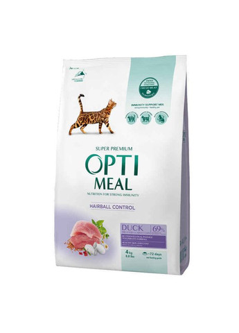 OPTIMEAL™. Повнораційний сухий корм для дорослих кішок з ефектом виведення вовни – качка Покращує кишкову прохідність та запобігає утворенню грудочок вовни у шлунку. Зміцнює імунітет Натуральна нерозчинна клітковина покращує кишкову прохідність і сприяє м'якому виведенню вовни природним шляхом, не утворюючи грудок у шлунку. Свіже м'ясо качки у вигляді фаршу забезпечує кота високоякісним легкозасвоюваним протеїном тваринного походження ягоди, натуральні антиоксиданти та пребіотики Омега-3 та 6, цинк, біотин допомагають підтримувати шкіру кота здоровою, а шерсть блискучою Містить 68,90% протеїнів тваринного походження SUPER PREMIUM формула. Раціон виготовляють під контролем ветеринарів за технологією швейцарської компанії Swiss Pet Nutrition Group Унікальний комплекс для підтримки та зміцнення імунітету Immunity Support Mix складається з: Спеціально очищені бета-глюкани – покращують роботу імунної системи для довгого життя вихованця. Пребіотик нового покоління Actigen – нормалізує баланс корисної мікрофлори кишечника та забезпечує здорове травлення. Натуральний антиоксидант SubStar ULTRA на основі розмарину завдяки протимікробним та протизапальним властивостям – запобігає руйнуванню клітин організму та захворюванням домашніх улюбленців. OMEGA 3 і 6/Цинк/Біотин – підтримують шкіру здоровою, а шерсть – красивою. Склад: дегідратований протеїн качки, не менше 26 %, рис, кукурудза, кукурудзяний білок, курячий жир, м'ясо без кістки 5 %, целюлоза натурального походження, протеїн гідролізований тваринний 3,5 %, куряча печінка гідролізована суха, мінерали1, cе 74 %, м'якоть буряків, пивні дріжджі, олія лосося 1 %, яєчний порошок, журавлина 0,2 %, олія огірковика 0,1 %, бета-1,3/1,6-глюкани 0,05 %, Actigen ® (джерело) пребіотик-мананоолігосахариди) 0,04%, чорнобривці (джерело лютеїну) 0,04%, корінь лопуха, корінь алтея, квіти ромашки 0,03%, кропива 0,03%, чебрець 0,015%. Добавки: Харчові добавки на 1 кг корму, мг/кг: вітамін А: 15 000 МО, вітамін Д3: 750 МО, вітамін Е: 600, вітамін С: 200, вітамін B6: 6, вітамін H (біотин): 0,08 , таурин: 2100, залізо: 35, йод: 2,5, мідь: 8,2, марганець: 38, цинк: 148, селен: 0,09, DL-метіонін: 2500. Технологічні добавки на 1 кг корму, мг/кг: природний антиоксидант: 300, екстракт токоферолу природного походження: 500. Харчова цінність 100 г корму: сирий протеїн – 34 г, сирий жир – 16 г, сира зола – 7,5 г, сира клітковина – 5,5 г, кальцій – 1,15 г, фосфор – 0,95 г, магній – 0,075 р. На 1 кг: омега-3 жирні кислоти - 5,4 г, омега-6 жирні кислоти - 28,2 г. 68,9% протеїнів корми- тваринного походження. Енергетична цінність(калорійність) 100 г корму: 1592,6 кДж (380,65 ккал). Зберігати у закритій споживчій тарі у темному місці при температурі від +5 ºС до +25 ºС та відносній вологості не більше 75 %. Корм необхідно вводити до раціону поступово (принаймні протягом перших 5-ти днів). Забезпечити тварині постійний доступ до чистої та свіжої питної води. Індивідуальні норми годівлі тварини можуть змінюватись, залежно від віку, породи, рівня активності та навколишнього середовища. Виготовлено за ліцензією, за технологією швейцарської компанії Swiss Pet Nutrition Group GmbH, BDO AG, Industriestrasse 53, P.O. Box 30, 6312 Steinhausen-Zug, Switzerland.