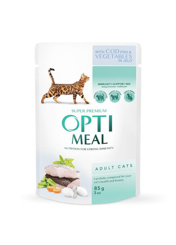 Волога консерва стане чудовим доповненням до щоденного раціону кота. Також вона може створити самостійне збалансоване живлення. У лінійці консервованих кормів є різні смаки, що дозволить урізноманітнити раціон тварини. Також склад має ретельно продуману рецептуру, що дозволяє підтримувати правильний баланс жирів, білків та вуглеводів в організмі вихованця. Ніжне м'ясо тріски приготоване в апетитному желі. Високий вміст тріски дозволяє наситити організм пухнастого улюбленця легкозасвоюваними та високоякісними протеїнами, що підтримують правильний рівень енергії, здоров'я та довголіття тварин. Рецепт доповнений імуностимулюючим комплексом, що ефективно захищає організм від вірусів і бактерій, а також позитивно впливає на шкіру, шерсть і шлунково-кишковий тракт кота. Переваги: Риба насичує організм білками, амінокислотами та омегами; Кислоти Омега підтримують здоров'я шкіри та блиск вовни; Найновіші пребіотики підтримують функціонування кишечника; Овочі є джерелом клітковини, що покращує травлення; Ягоди насичують організм вітамінами та мікроелементами; Лікарські трави мають антибактерицидний і протизастудний ефект; Таурін покращує роботу серця та підтримує здоров'я очей; DL-метіонін прискорює спалювання жирів і дозволяє підтримувати оптимальну вагу; Додаткове джерело вологи для запобігання розвитку хвороб сечовивідних шляхів. Склад: 67% м'яса та продуктів тваринного походження в шматочках (у тому числі 15% з курки, 10% серце яловиче та інші), риба та рибні продукти (18% тріски в шматочках), екстракти рослинного білка, овочі (морква, не менше) 2 %, олія, не менше лосося, олія з огірка), продукти рослинного походження (зокрема журавлина 0,05 %, чорнобривці (джерело лютеїну) 0,01 %, корінь лопуха, корінь алтею, квіти ромашки 0,01 %, кропива 0,01 %, чебрець 0,0 пребіотик-мананоолігосахариди) 0,01%, бета-1,3/1,6-глюкани 0,01%. Добавки: Поживні добавки (на 1 кг корму), мг/кг: вітамін Д3 (3a671): 150 МО, вітамін Е (3a700): 100, вітамін C (3a300): 40, кальцію Д пантотенат (3а841): 2,1,8,7 кислота (3а316): 0,49, вітамін В6 (3a831): 0,28, біотин (3a880): 0,04, таурин (3a370): 506,02, DL-метіонін (3с301): 600, цинк (3b60 1,56, йод (3b201): 0,32, селен (3b801): 0,1 мкг. Поживна цінність (аналіз) корму: сирий протеїн – 12 %, сирий жир – 4,5 %, сира попел – 1,6 %, сира клітковина – 0,3 %, вологість – 79 %, кальцій – 0,2 %, фосфор – 0,18 %, магній – 0,02 %. На 1 кг Омега-3 жирні кислоти – 0,52 г, Омега-6 жирні кислоти – 2,3 г. 66% протеїнів корму – тваринного та рибного походження. Енергетична цінність: 100 г корму: 365 кДж (87,24 ккал). Поради щодо годування: Порція корму має бути кімнатної температури. Корм необхідно вводити поступово (принаймні протягом перших 5-ти днів). Забезпечити тварині постійний доступ до чистої питної води. Індивідуальні норми годування можуть змінюватися, залежно від віку, породи, рівня активності та середовища перебування тварини. Рекомендоване денне годування Вага дорослого кота, кг Кількість корму, шт 3 2+½ 4 3 5 3+½ 6 4 Зберігати у сухому місці при температурі від +6 ºС до +30 ºС. Корм у відкритій упаковці зберігати у холодильнику не довше 48 годин. Термін придатності: 24 місяці з дати виробництва. Фасування: 85 г