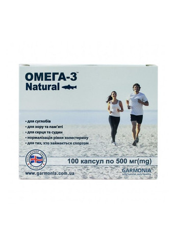 Омега-3 Garmonia 100 капсул по 500 мг Ісландія-Україна - це комплекс поліненасичених жирних кислот, особливо необхідних для здоров'я людини. Без цих речовин робота багатьох систем і органів буде неповноцінною, а то і зовсім неможливою. Але вони не виробляються в організмі людини, тому вкрай важливо вживати продукти, що містять Омега-3 в достатній кількості. Кислоти Омега-3 забезпечують молодість і сили організму, активну роботу мозку і міцний імунітет. Крім цього, вони покращують роботу серцево-судинної системи, насичуючи кров безліччю поживних елементів. Комплекс ефективно протистоїть багатьох захворювань, у тому числі психічних, а також зменшує ризик виникнення стресу і депресії. Для благополучного розвитку дитини Омега-3 також незамінні - вони беруть участь в процесі росту всього дитячого організму, від кісток до судин, стимулюють розумову активність і пам'ять. Дія є відмінною профілактикою серцево-судинних захворювань; регулює кров'яний тиск, знижують ризик тромбозу; уповільнює процеси старіння; покращує пам'ять і роботу мозку; покращує зір, підвищує тонус очей; сприятливо впливає на стан шкіри і волосся; служить профілактикою онкологічних захворювань; виводить з організму вільні радикали, що завдають шкоди клітинам; протистоїть запаленням і злоякісним новоутворенням; сприятливо впливають на здоровий ріст плода під час вагітності; загоює ушкодження шкіри і слизової оболонки (наприклад, при виразці шлунка); знижує ризик переломів і остеопорозу, зміцнює кісткову тканину і підвищують рівень кальцію; збільшує вироблення в організмі серотоніну і зменшує кількість гормонів стресу; бореться з депресією. Застосування: дорослим і дітям старше 11 років по 4 капсули один раз на день, під час прийому їжі, запиваючи достатньою кількістю води. Середній курс - 2-3 місяці. Склад: на одну капсулу: омега-3 риб'ячий жир, 500 мг, яка містить омега-3 поліненасичені жирні кислоти у формі природних тригліцеридів - 165 мг, желатин, гліцерин (оболонка капсули). На 1 капсулу: ЕПК-80 мг. ДГК-52 мг. Термін зберігання: 2 роки. Виробник: Ісландія (сировину), Чехія (гліцерин), Німеччина (желатин).
