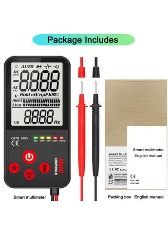 ArrayТепер, коли ми вступили в еру інтелекту, багатофункціональні цифрові мультиметри також були замінені інтелектуальними. Цей цифровий мультиметр може не тільки задовольнити потреби вимірювання повсякденного життя, але і стати професійним інструментом навчання вимірам. Особливості: Технологія РК-дисплея EBTN: РК-дисплей EBTN забезпечує ключові переваги в продуктивності порівняно з традиційною технологією РК-дисплея, значно покращує сприйняття при читанні, підсвічені цифри і букви на чорному фоні дуже легко читається навіть при яскравому сонячному світлі або слабкому освітленні. Великий екран 3-рядковий дисплей: дуже великий 3,5-дюймовий екран може відображати 3 результату тесту, таких як напруга, частота і аналогова смуга. Автоматична ідентифікація: цей мультиметр, розроблений для початківців, може автоматично ідентифікувати досліджувані параметри і вибирати потрібний діапазон. Ультратонкий дизайн: товщина всього 12 мм, світліше, і з великим РК-дисплеєм, який виглядає як телефон. Простий / зручний / простий у використанні: конструкція мультиметра з датчиками дозволяє проводити безпечне і ефективне тестування, не потрібно підключати і відключати датчики, що не тільки може заощадити час на навчання і тестування, але і уникнути неправильної установки портів. Функція ліхтарика і отвір для підвішування: дизайн ліхтарика дозволяє ефективно і комфортно проводити випробування в будь-якому місці, в приміщенні і на вулиці, вдень і вночі. Конструкція отвори для підвішування робить його портативним. Один клацання, щоб відкрити інтелектуальне розпізнавання, не потрібно перемикати передачі, прощай, громіздко. Функції: тестування напруги змінного і постійного струму, тестування опору і безперервності, частотне тестування, тестування ємності, зберігання даних, автоматичне відключення, визначення лінії запалювання нульової лінії LIVE, аварійний сигнал небезпечної напруги V ~ RMS, TRUE RMS, автоматична ідентифікація включення-виключення діода, діод може загорітися випробувальний струм, автоматичний діапазон вимірювання, захист від перевантаження повного діапазону вимірювання. Характеристики: Матеріал: ABS Колір: чорний + червоний Дисплей: РК-дисплей, 9999 відліків Розмір РК-дисплея: 3,5" Харчування: батарея 2 * CR2032, 3, 210 маг (в комплекті) Максимальна допустима напруга на кінці виміру: 600 В постійного струму або 600 В змінного струму (RMS) Робоча висота: максимум 2000м Час відгуку: 3 рази / сек Дисплей блоку: з функцією, дисплей блоку живлення Час автоматичного вимикання: 3 хвилини Підсвічування: 15 секунд автоматичного режиму очікування Постійне напруга: Діапазон: 600 Роздільна здатність: 0.1 В Точність: ± (0,8% + 3 рахунки) Чутливість: мінімум 0,5 В постійної напруги Вхідний опір: 10 МОм Максимальна вхідна напруга: 600 В постійного або змінного струму (RMS) Змінну напругу: Діапазон: 600 Роздільна здатність: 0.1 В Точність: ± (1,2% + 5 відліків) Чутливість: мінімальна напруга змінного струму 1 Вхідний опір: 10 МОм Максимальна вхідна напруга: 600 В постійного або змінного струму (RMS) Діапазон частот: 50 Гц ~ 60 Гц, справжня середньоквадратична характеристика Опір: Діапазон: 10 МОм Дозвіл: 1Ω Точність: ± (1,2% + 3 рахунки) Захист від перевантаження: максимум 250 В постійного або змінного струму (RMS) Частота: Діапазон: 1000 Гц Дозвіл: 1 Гц Точність: ± (2,0% + 10 відліків) Діапазон частот: 10 Гц ~ 1000 Гц Допустиме з