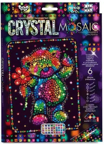 Набір для творчості Crystal Mosaic від виробника Danko Toys За допомогою дрібних камінчиків потрібно створити яскраву картинку. Це заняття сприяє розвитку дрібної моторики рук, спритності, фантазії, творчих навичок, уважності та інших якостей. Звичайна картинка може перетворитися в прекрасний витвір - варто тільки докласти паєтки на картинку-основу. У підсумку картина вийде блискучою, красивою і незвичайною. Таким набором можна прикрасити свою кімнату або зробити оригінальний подарунок комусь. Мозаїка з кристалів це не просто красива картина, зроблена своїми руками, а й дивовижна можливість відчути себе майстром "ювелірного мистецтва", адже кожен кристал встановлюється за велінням Вашого серця і з Вашим уявленням про прекрасне. У комплекті є основа з липким шаром, а також набір мозаїк із 6 різних форм. Послідовність розміщення камінчиків дитина може вибирати сама або скористатися картинкою - прикладом на упаковці творчого набору. Виробник використовує екологічно чисті нешкідливі для здоров'я матеріали. Рекомендований вік із 5 років. Матеріал – пластик, картон. Розмір упаковки: 28х22х1, 5 см. Відправимо по всій Україні оптом і в роздріб