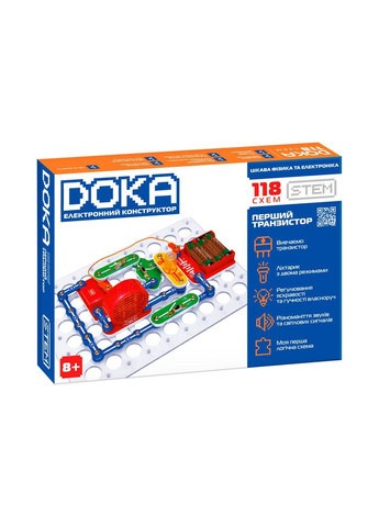 Конструктор електронний DOKA - '118 СХЕМ'- прекрасний подарунок дитині 5 років, яка хоче відчути себе юним інженером! Конструктор дозволяє дитині своїми руками створювати світлові і звукові сигналізації, ліхтарик з трьома режимами, допоможе в знайомстві з логічними елементами, вивченні транзистора, регулюванні яскравості і гучності. Завдяки оригінальному способу з'єднання деталей Ви зможете домогтися швидкого і ефективного результату без використання паяння. За допомогою конструктора можна зібрати такі схеми: Ліхтарик, Резистор як обмежувач струму, Лампи при паралельному і послідовному з'єднаннях, Резистор і реостат при паралельному і послідовному з'єднаннях, Тестер електропровідності, Звук і світло, Одночасне регулювання яскравості і гучності, Сирена з підсилювачем, Сигналізація на замикання і розмикання, Миготливі світлодіод і лампа, Логічні елементи 'І', 'АБО', 'І-НЕ', 'АБО-НЕ', Шунтування та багато інших. Конструктор складається з наступних елементів: Дріт з 1, 2, 3, 4, 5 сполучними клемами, Кнопка, Вимикач, Динамік, Сигнальна ІС, Резистори, Лампа, Транзистор, Батарейний відсік, Перекидний вимикач, Світлодіод синій, Гнучкий дріт. У комплект також входить інструкція, за допомогою якої малюк зможе зібрати 118 електросхем, що дозволяють на практиці освоїти ази управління світлом, звуком і електрикою. Електронний конструктор розвиває в дитині: дрібну моторику, увагу, логіку, пам'ять, математичні поняття. Живлення: батарейки 3хАА (не входять до комплекту). Рекомендовано для дітей віком від 8 років.