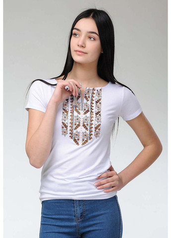 Акуратна білосніжна вишита футболка для жінок цієї моделі є унікальним свідком багатства української вишивки. Для її створення дизайнери використали давні зразки вишивки. Відтінки коричневого кольору створили абсолютний настрій стриманості та сили. Хоч композиція виконана в геометричному стилі, проте яскраво видно нотки дубових гілок та жолудів. Як-то кажуть, читати треба між рядків. Орнаменти розташовані спереду в зоні декольте. В основі білосніжна тканина з віскози та еластану. Вона легка та якісна, тому не буде створювати дискомфорту та деформації після багаторазового прання.